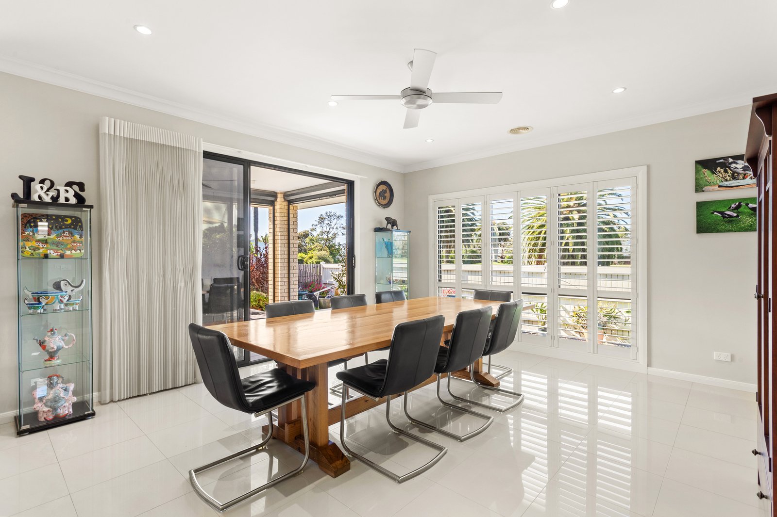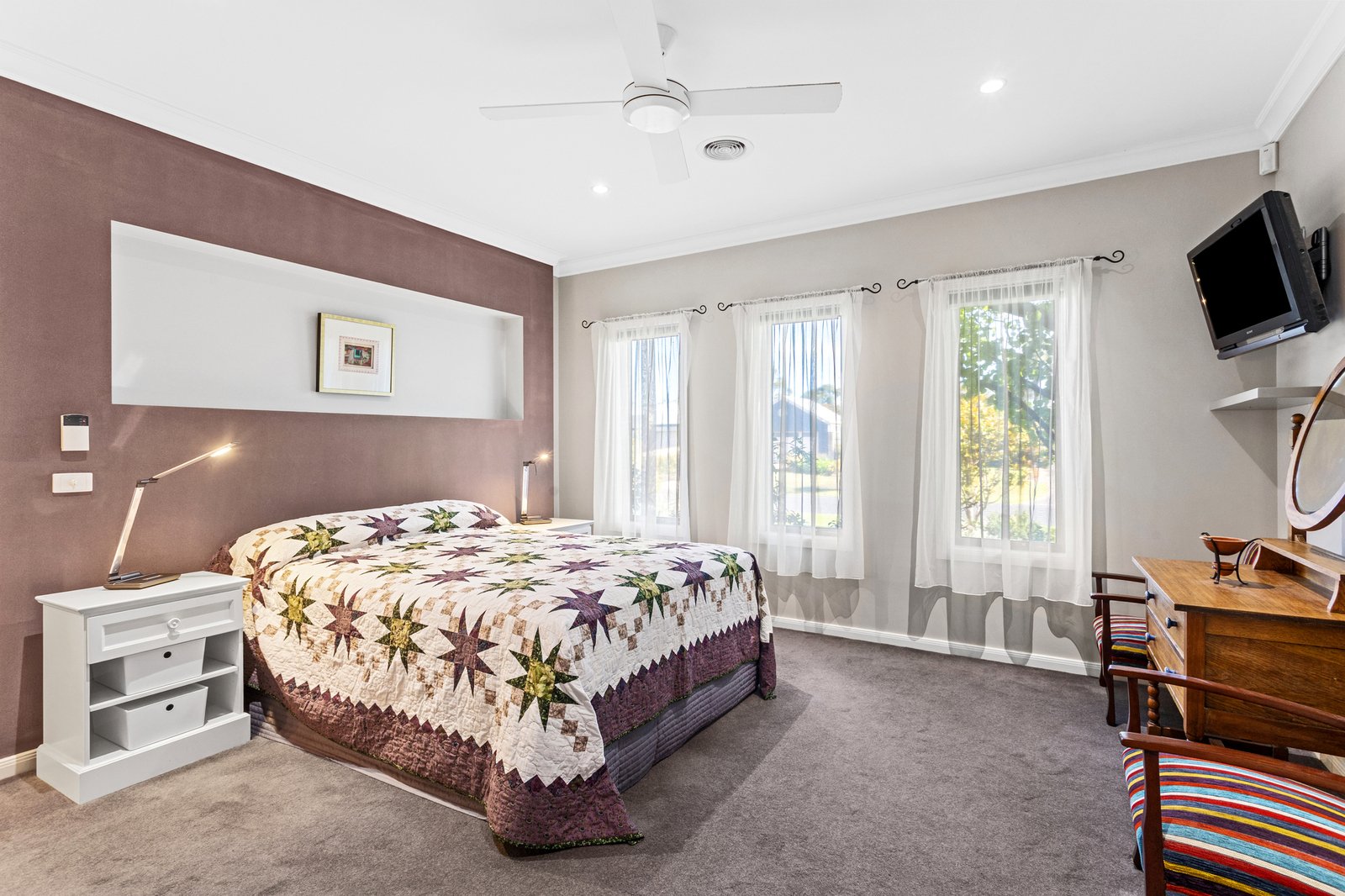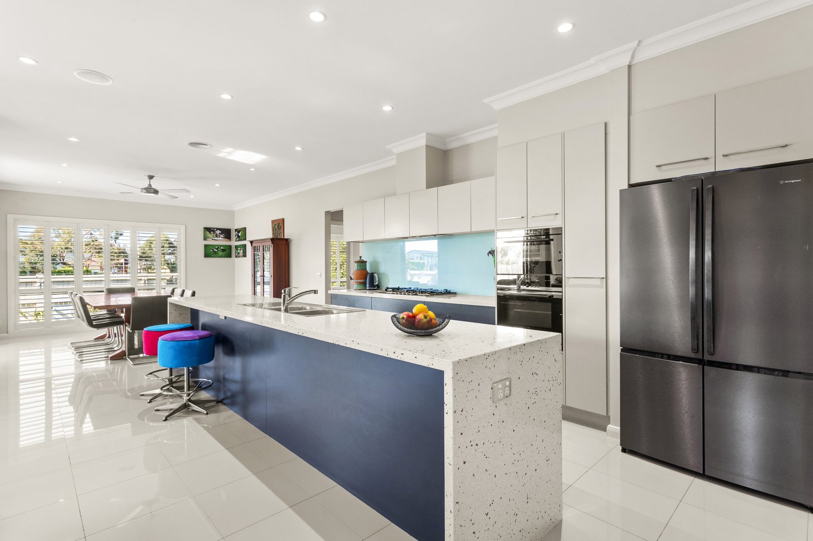 Flanked by two living areas, the kitchen is crafted to handle the full spectrum of family life, with a speckled stone island, twin ovens and an extensive butler’s pantry to keep daily clutter out of sight. The fireside lounge extends to a covered alfresco deck, where café blinds and fairway views create an effortless setting for year-round entertaining and outdoor dining, with the low-maintenance garden forming a relaxed green border beyond.