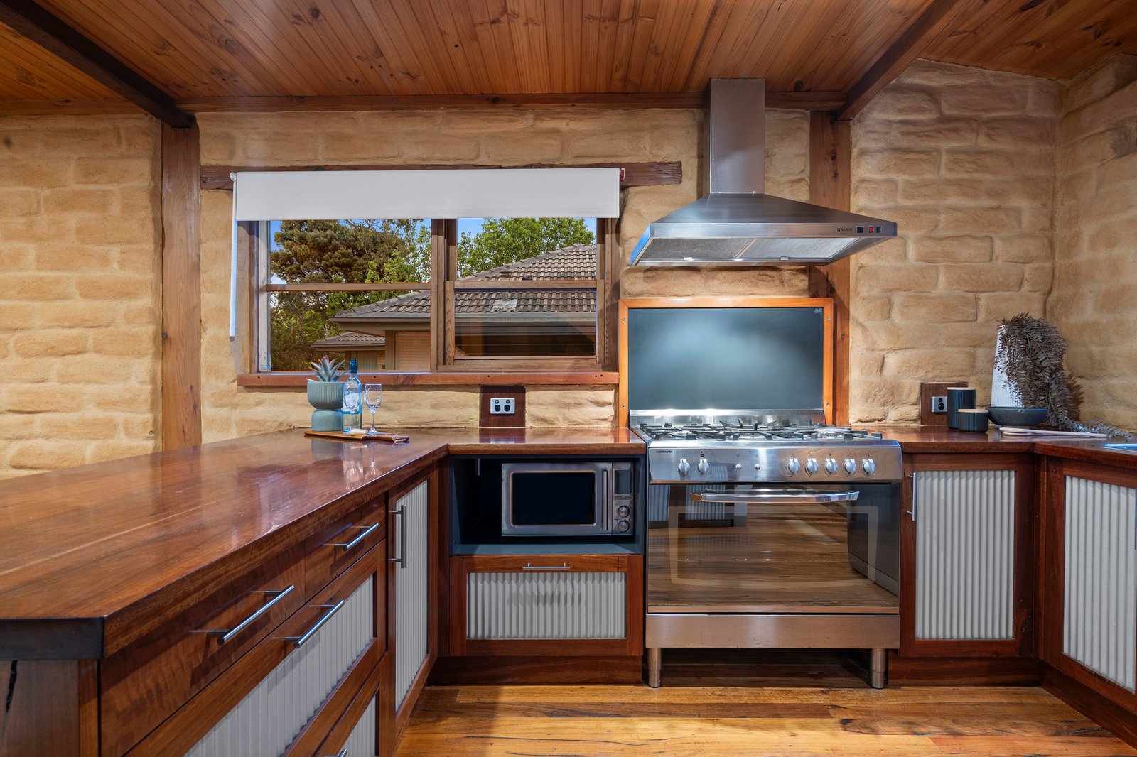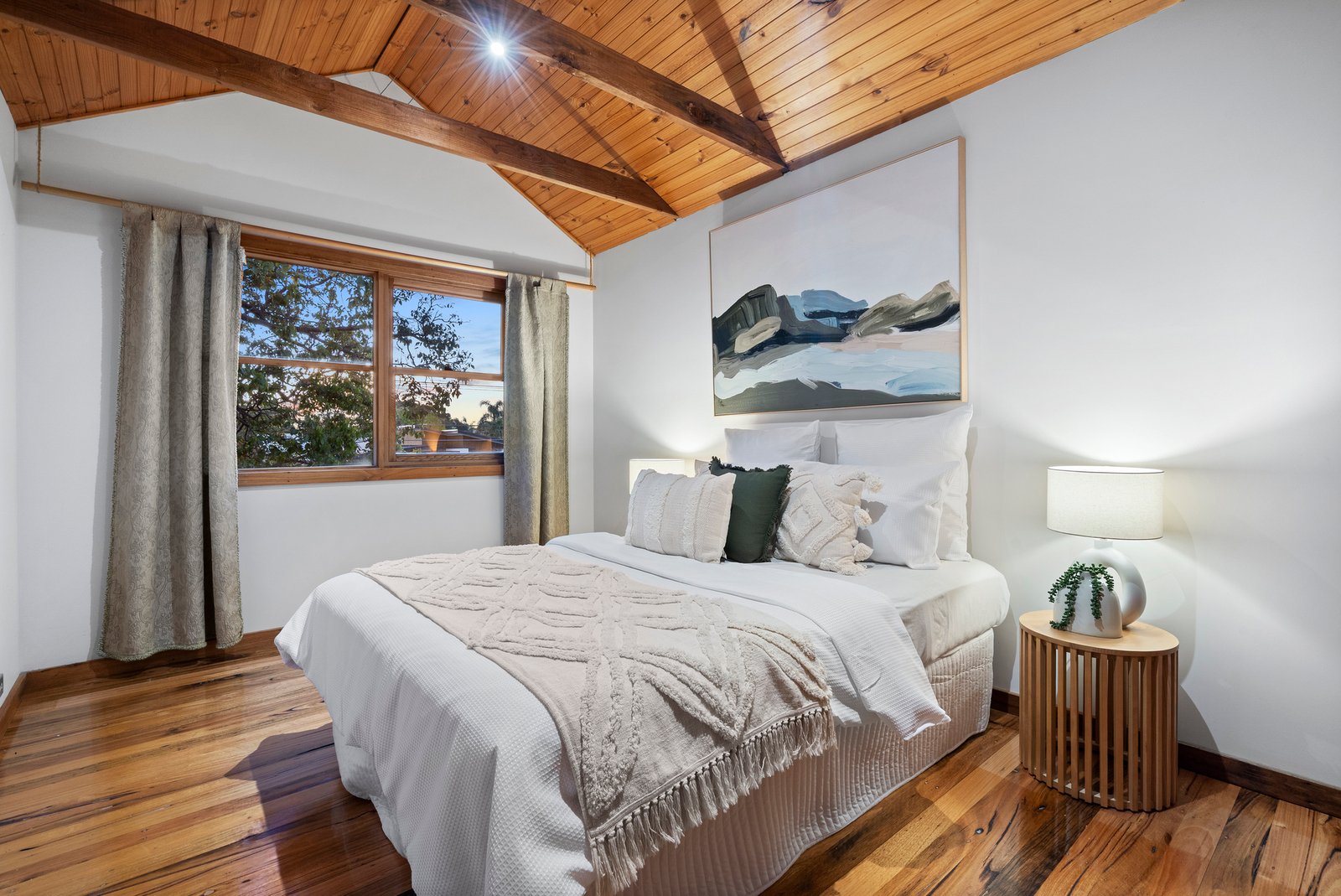 Beyond its classic earthy façade and established landscaping with boardwalk-like path, an open plan lounge and dining area provides the perfect welcome. Set under timber-lined ceilings and taking in verdant garden views, this idyllic garden-view space is complemented by a well-equipped entertainer’s kitchen where rich timber sits harmoniously alongside ample storage, a 900mm Germania oven and stainless steel dishwasher.