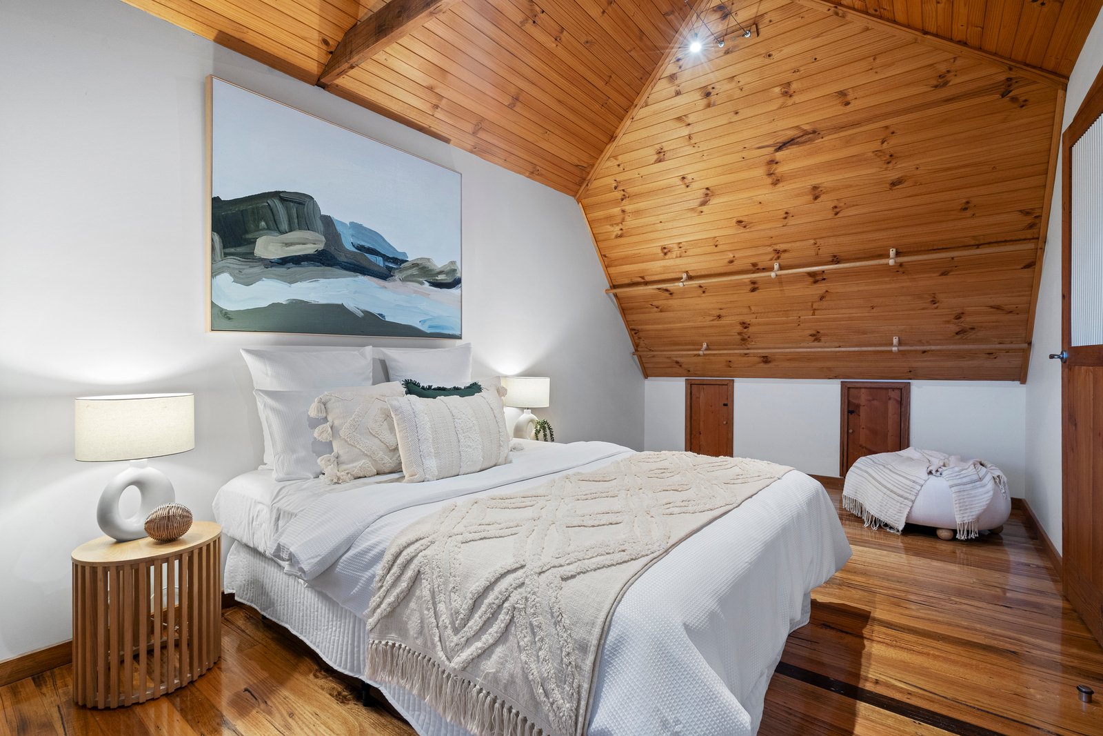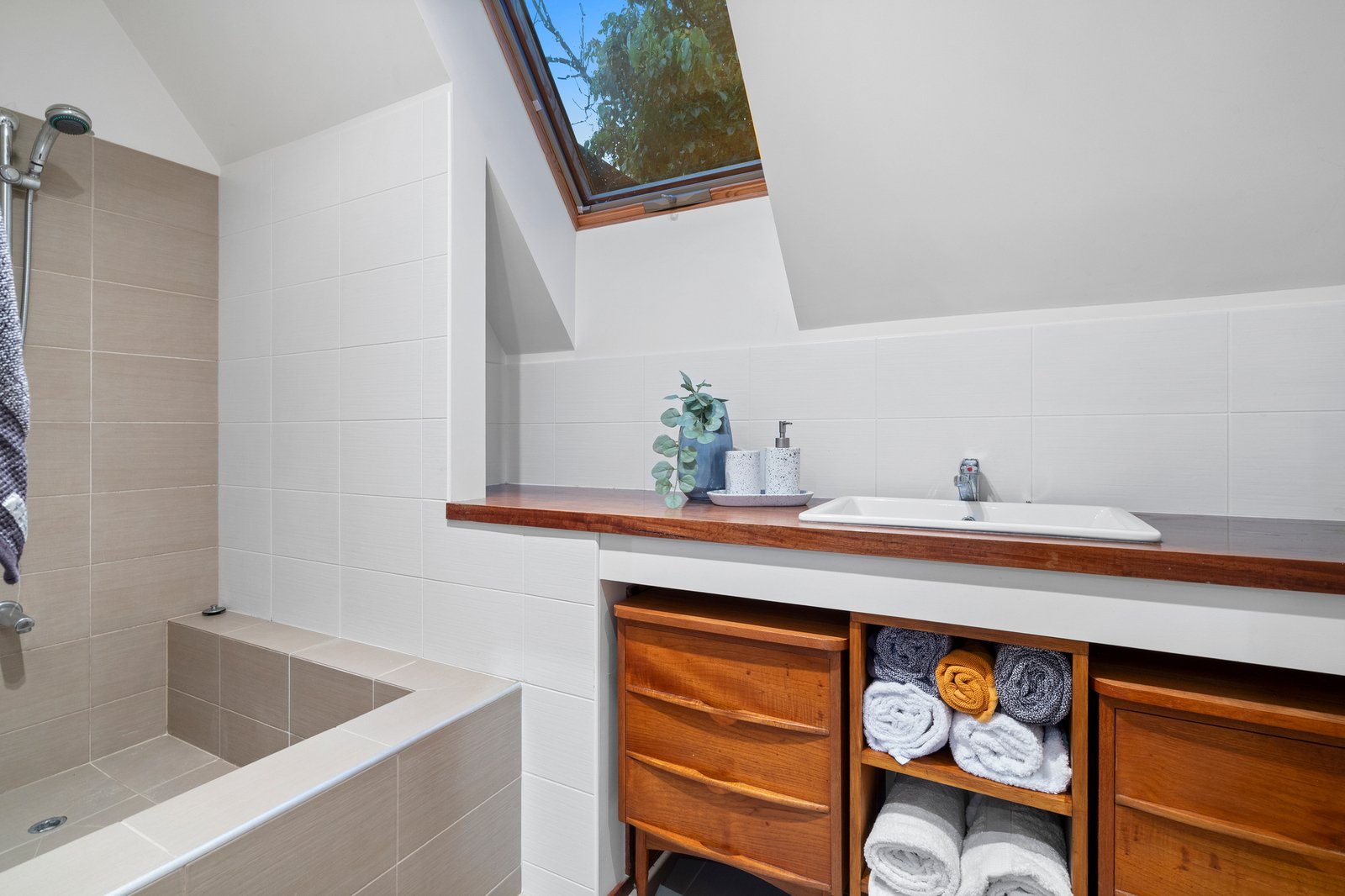 Two upstairs bedrooms are crowned by lofty ceilings. They share a central bathroom with shower/bath and skylight – a ground floor laundry, shower and WC are also offered.