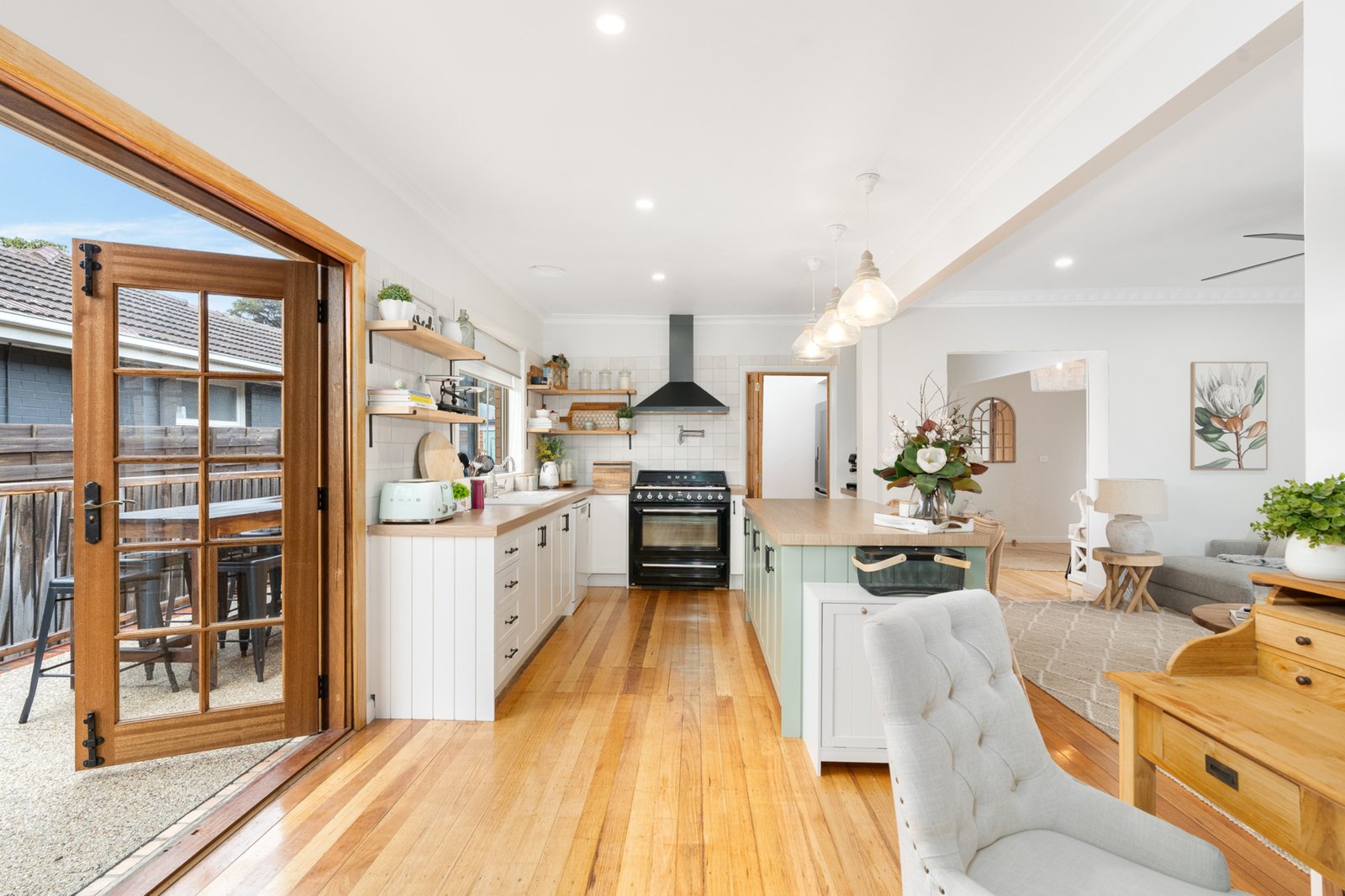 Behind the private rendered fence, a warm and welcoming home unfolds with polished timber floors, soft neutral tones and an inviting living room anchored by a stone feature fireplace. At the centre of the home, the stunning kitchen offers a SMEG freestanding cooker, long island bench, open shelving and walk in pantry, flowing seamlessly to the dining area and out through French doors to the alfresco.