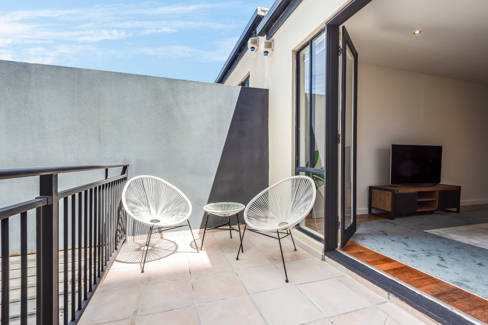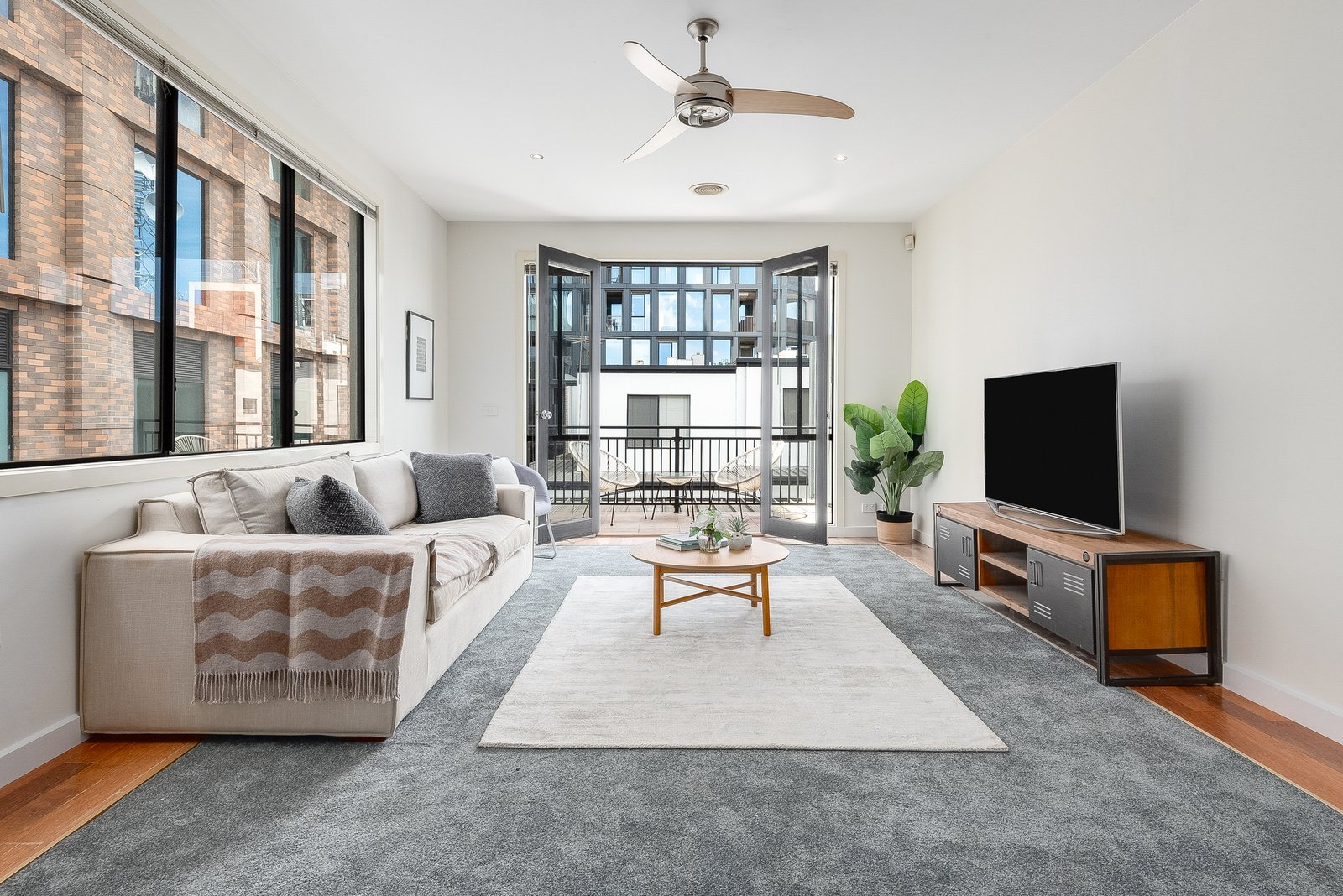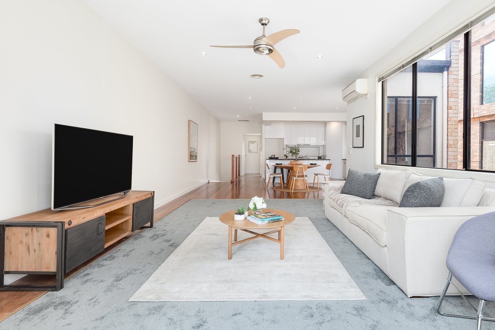 The classic townhouse façade is timeless in style. Inside, the entry welcomes you with a beautiful timber staircase ascending to the open plan kitchen, dining and living area. Light interiors, timber flooring and square set ceilings, showcase the sophisticated style within. The elegant kitchen features beautiful stone benchtops, quality cooking appliances including a 600mm oven and gas cooktop, Bosch dishwasher, ample bench space and generous storage. Positioned to overlook the dining area, the layout caters for easy everyday living and impressive entertaining. Beautiful French doors open up from the living area to a generous balcony, offering the perfect space to relax with a coffee or glass of wine and take in the vibrant city atmosphere.