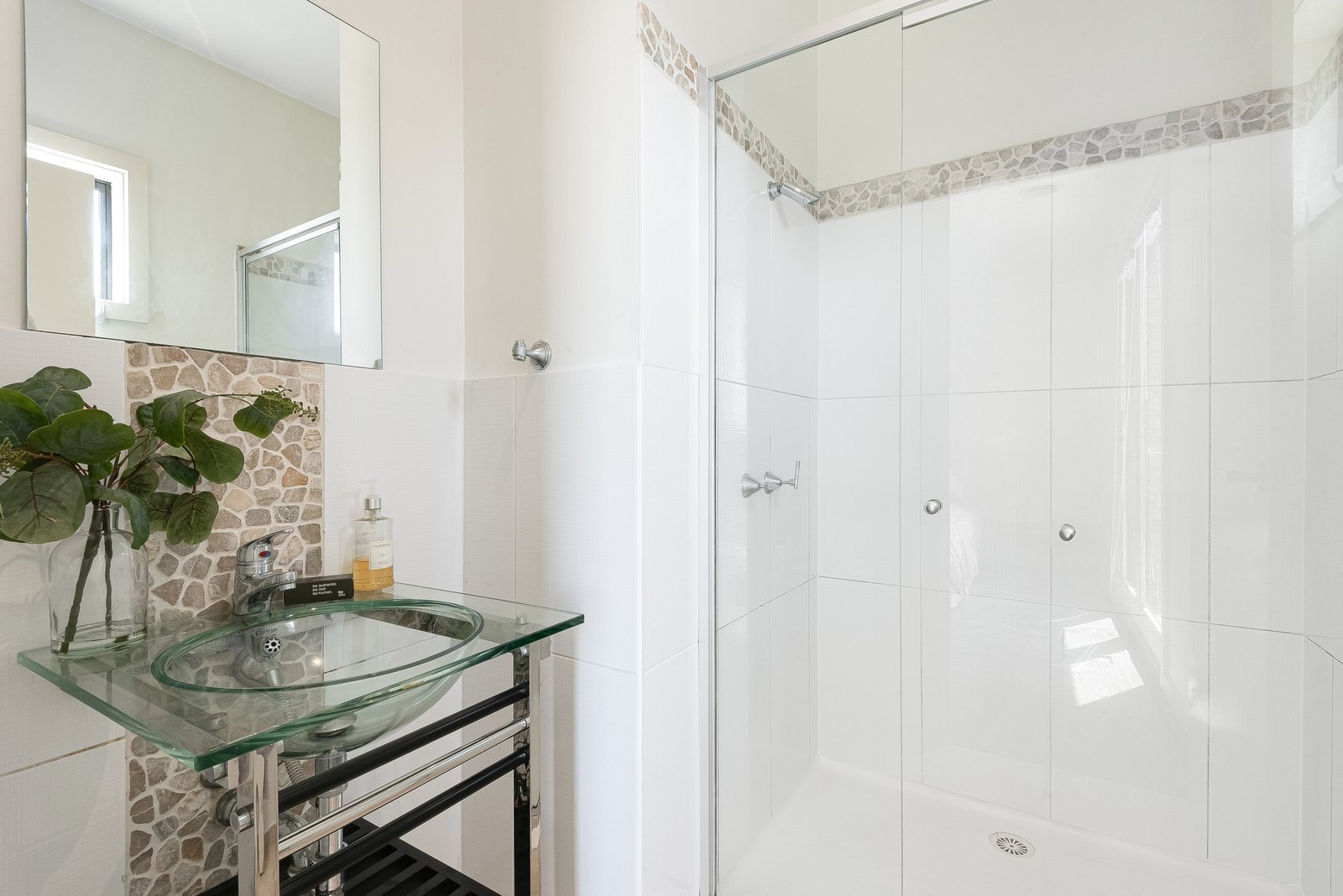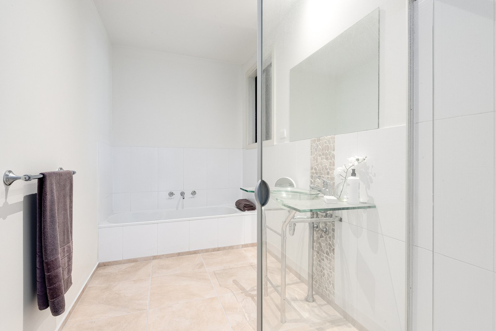 The main bedroom is a private retreat with its own balcony, built-in robes and a stylish ensuite with stunning glass vanity and a spacious shower. Two further bedrooms are separately zoned on the ground floor, both include built-in robes, serviced by a bright main bathroom presented in contemporary finishes and a separate wc.