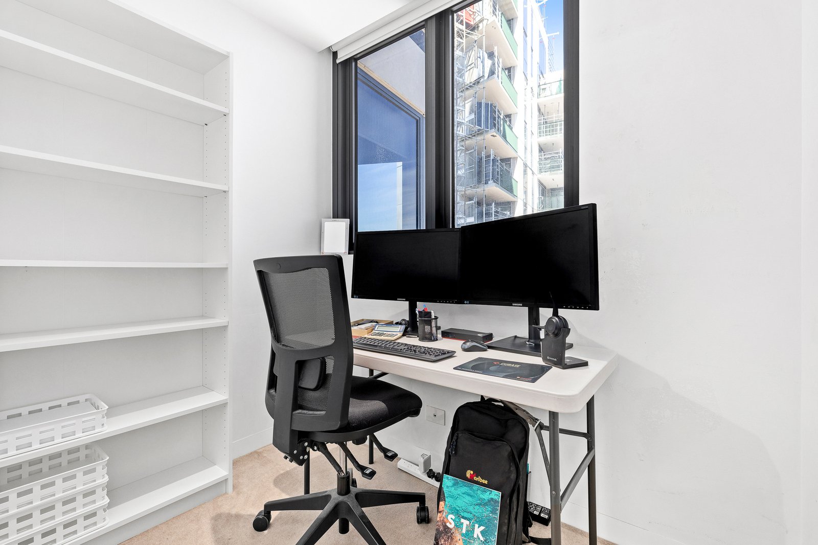 A generously sized and robed bedroom is serviced by a luxe bathroom flaunting mirrored cabinetry, floor-to-ceiling tiles, and a rainfall shower fitting. Additionally, a compact study adds a professional touch to every work-from-home day.