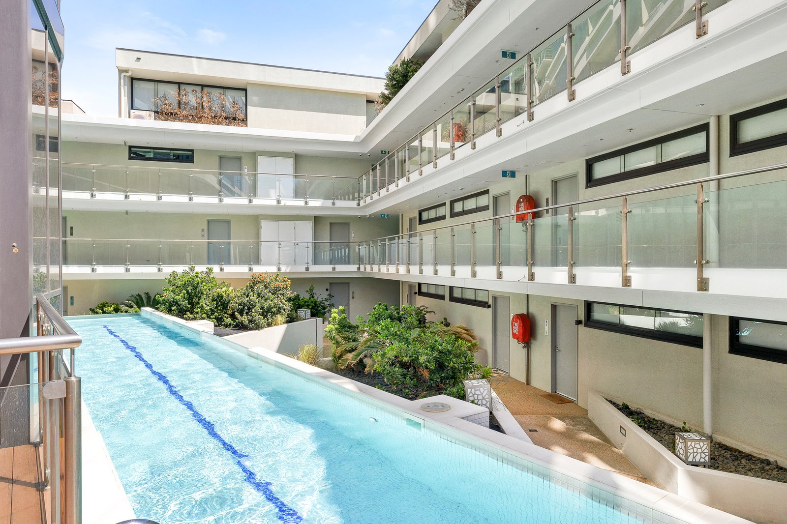Placed to perfection on the tenth floor of resort-inspired STK complex, spacious open-plan living/dining is underscored by a stone-finished kitchen showcasing a waterfall-edged breakfast bar and stainless-steel appliances including a high-end Asko dishwasher.