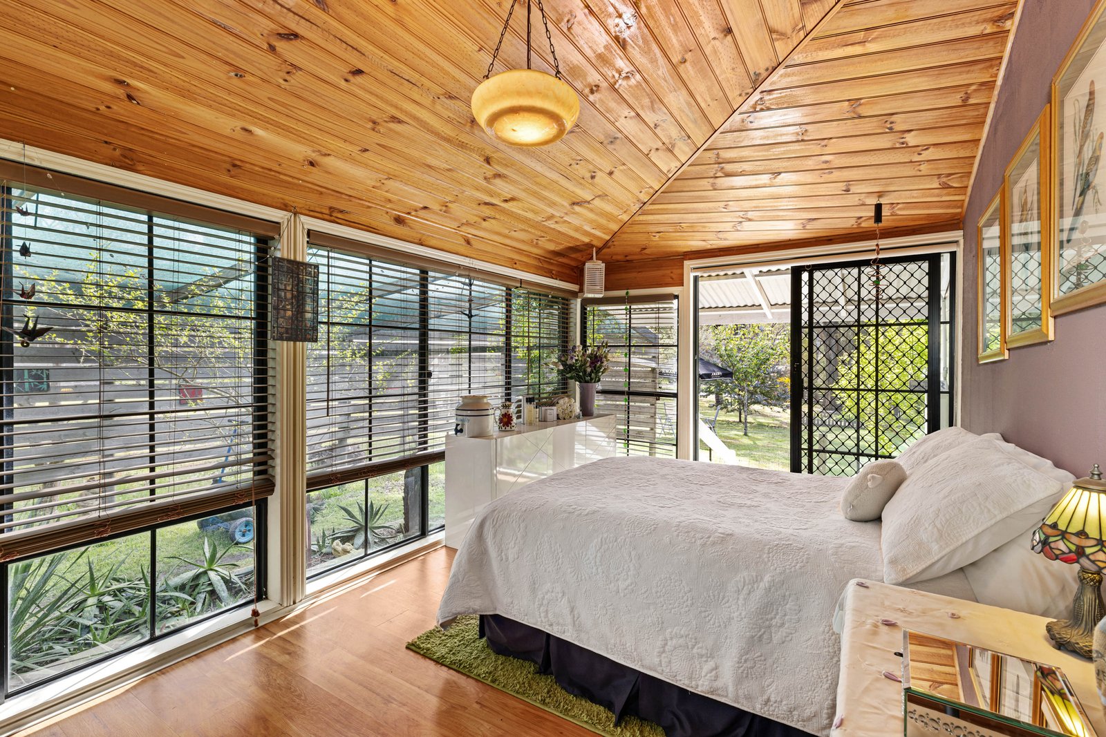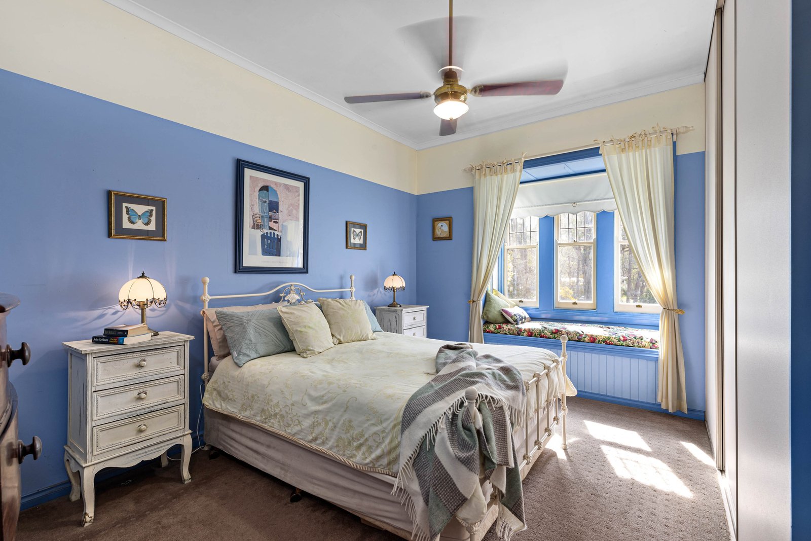 The master bedroom with high ceilings and box bay seating window looks out across the front yard and dam.