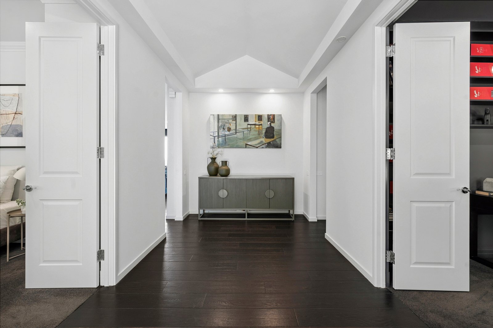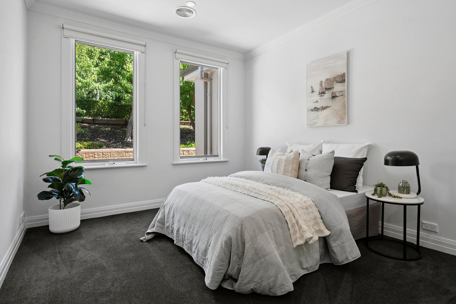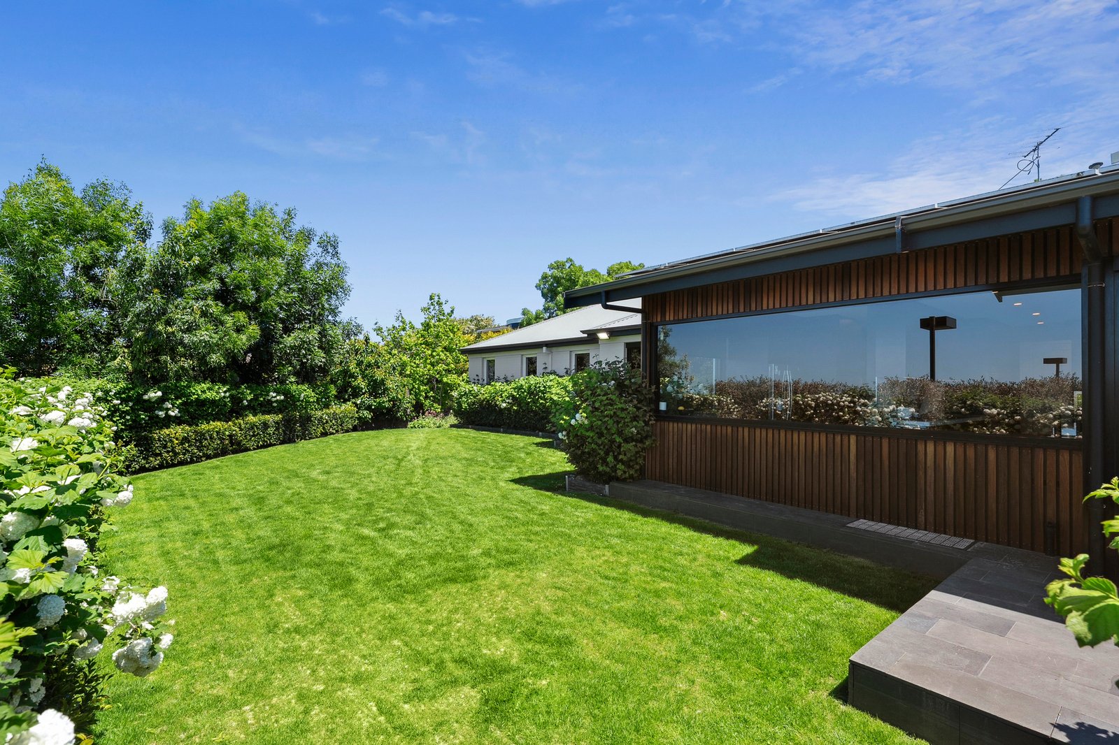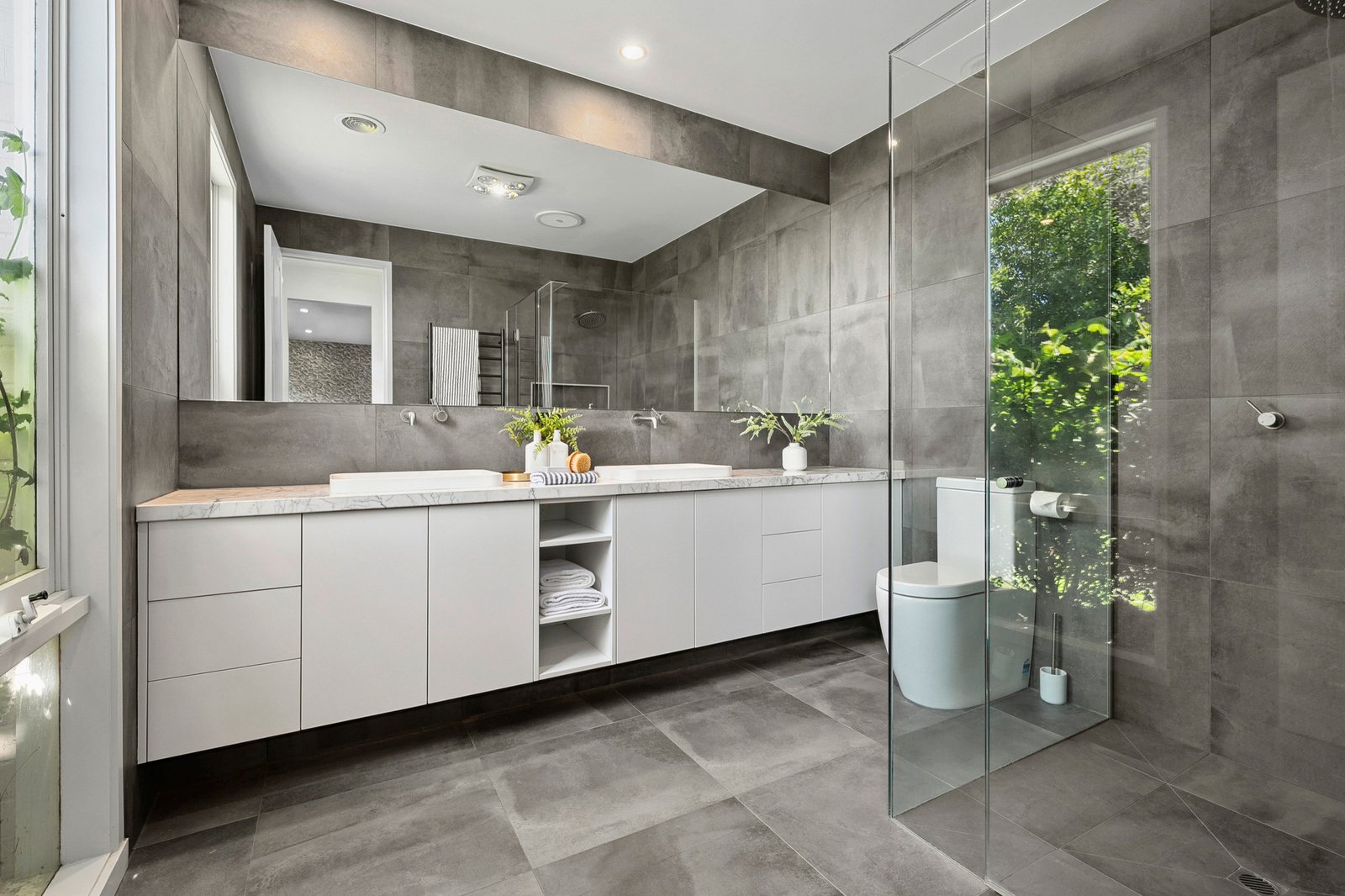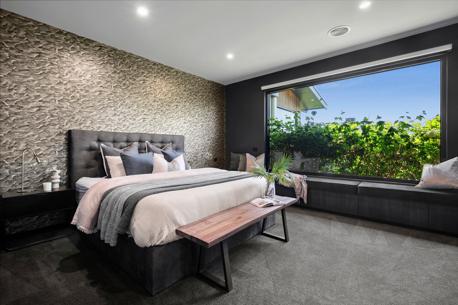 The main bedroom is an opulent retreat, presented in a rich colour palette, with a large picture window and garden vista, built-in window seating, generous walk-in robes, and a tastefully presented ensuite finished in floor to ceiling tiles, with double vanity, frameless glass shower, and heated towel rail. Bedrooms two and three include walk-in robes, bedroom four with built-in robes, and the privately zoned fifth bedroom includes dual built-in robes plus a stylish ensuite, perfect for a guest room or teenager’s retreat. The main bathroom features a contemporary freestanding bath, separate shower, modern vanity, heated towel rail and beautiful brass tapware.