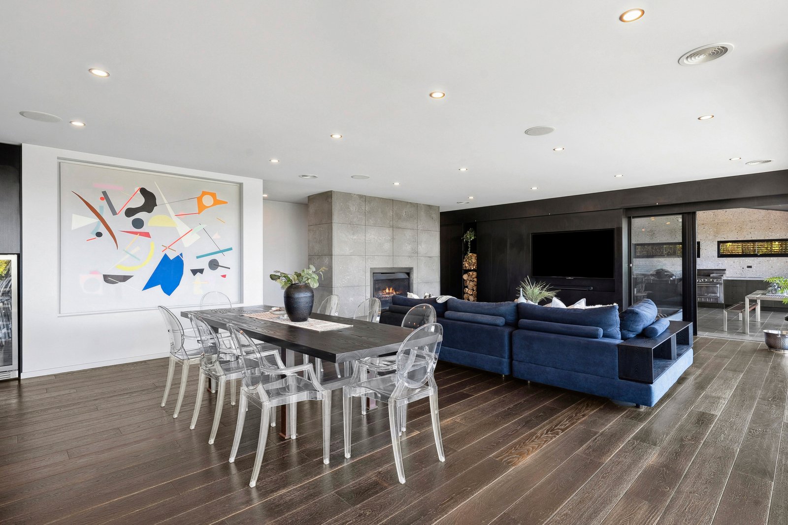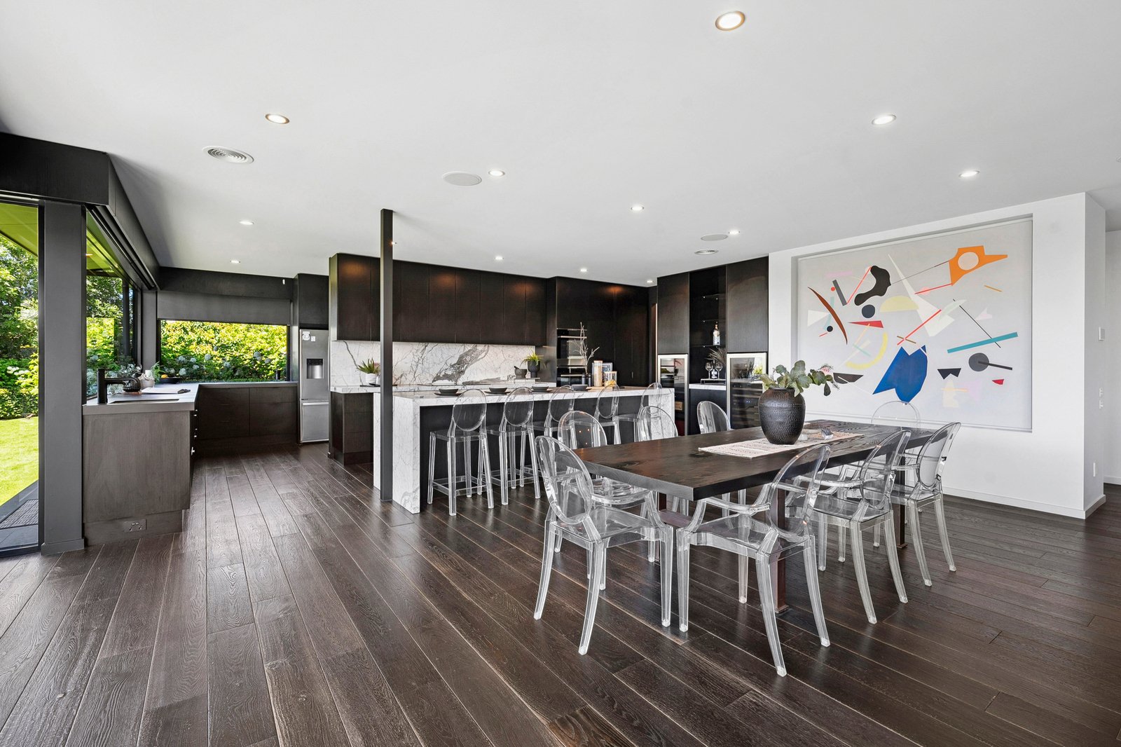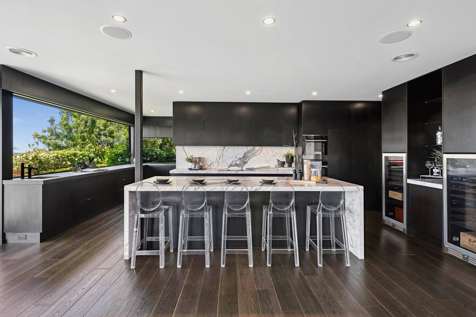 Set behind spectacular established gardens, the terraced grounds descend with the landscape to create a private and secluded setting. Inside, a wide entry hall with cathedral ceilings greets you within, introducing the grand proportions and elegant style of the interiors. Stepping through to the heart of the home, an expansive open plan kitchen, dining and living area captures magnificent views across the infinity pool and tennis court, extending out to the city skyline and bay, creating a breathtaking backdrop to everyday living. The high-end kitchen features a large island, waterfall benchtops, quality appliances, including dual 600mm ovens, induction cooktop, fully integrated dishwasher, and a large butler’s pantry with second dishwasher, wine fridge, and additional preparation space, perfect for those who love to entertain. Adjoining bar facilities include two built-in wine cabinets, ensuring your red and white collections are stored at optimum temperatures. The living area features a fireplace for a cosy and inviting ambience, with built-in joinery and wood storage adding both style and functionality. Double doors take you through to a spacious second living area, providing an alternative space to retreat, watch a movie, or send the kids to play, with a walk-in storeroom.