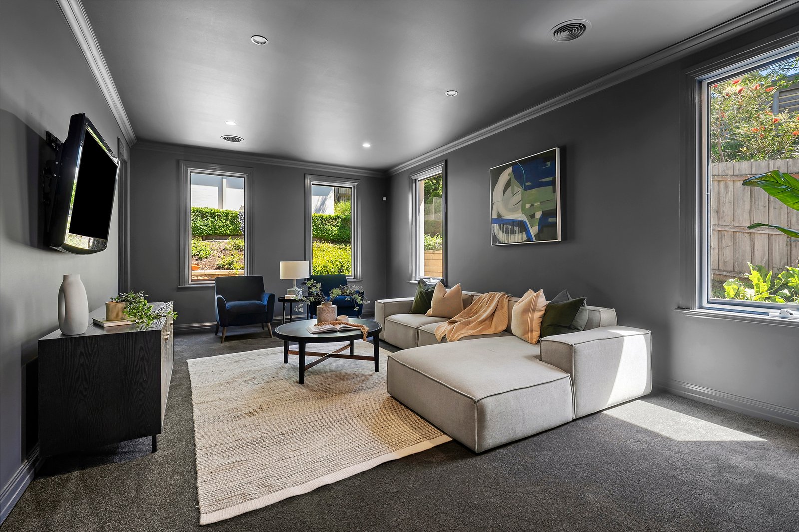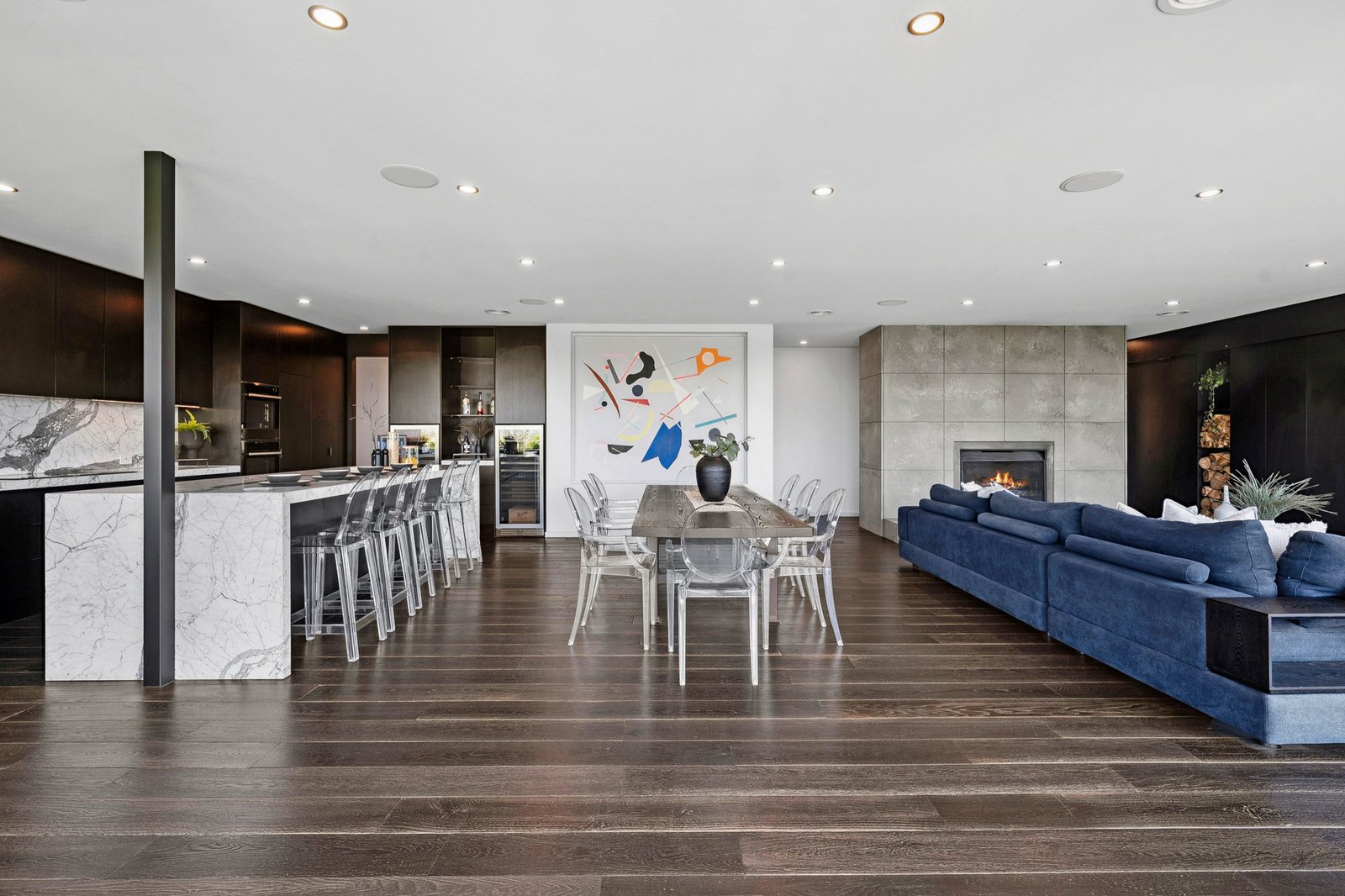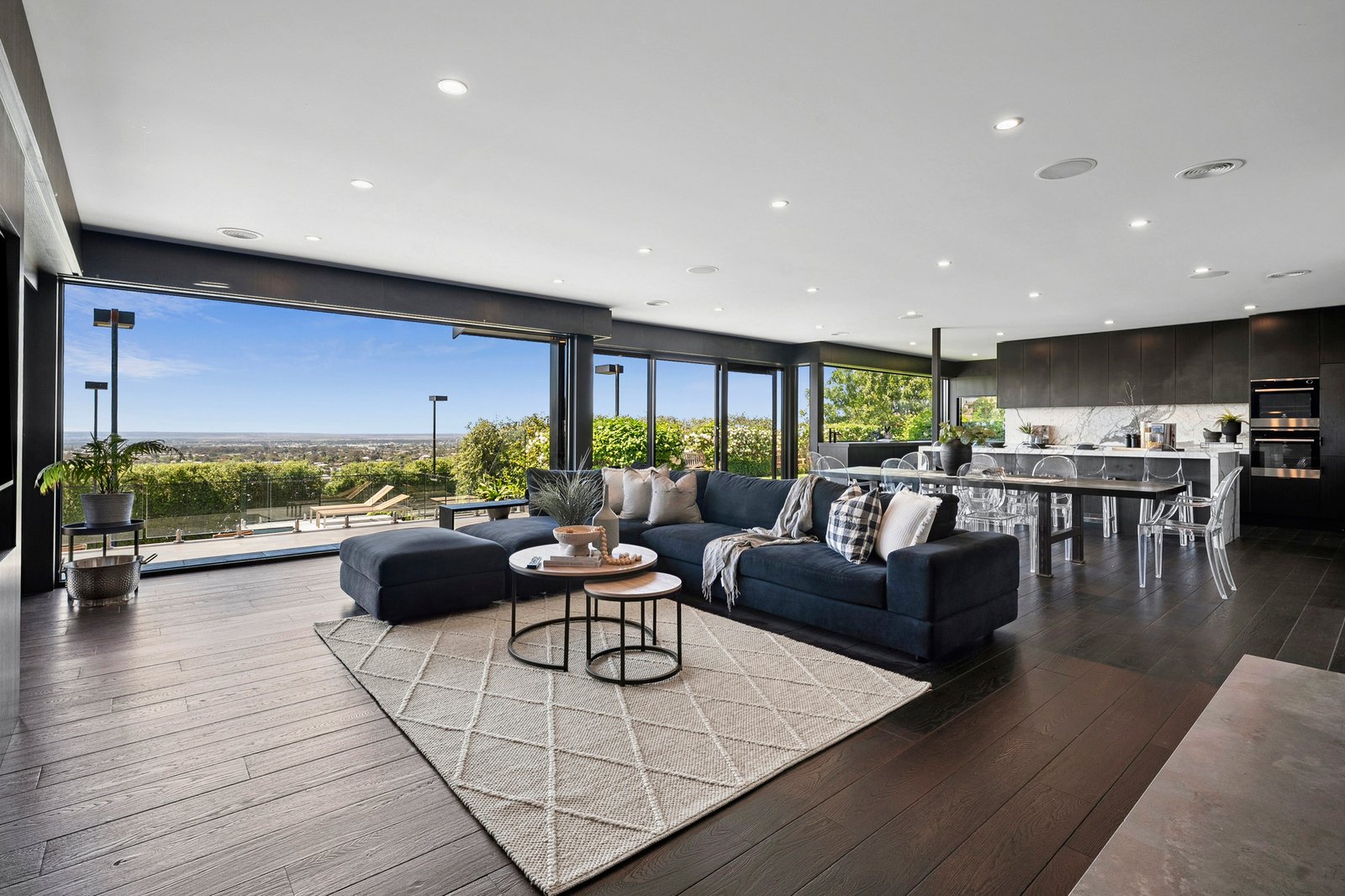 Set behind spectacular established gardens, the terraced grounds descend with the landscape to create a private and secluded setting. Inside, a wide entry hall with cathedral ceilings greets you within, introducing the grand proportions and elegant style of the interiors. Stepping through to the heart of the home, an expansive open plan kitchen, dining and living area captures magnificent views across the infinity pool and tennis court, extending out to the city skyline and bay, creating a breathtaking backdrop to everyday living. The high-end kitchen features a large island, waterfall benchtops, quality appliances, including dual 600mm ovens, induction cooktop, fully integrated dishwasher, and a large butler’s pantry with second dishwasher, wine fridge, and additional preparation space, perfect for those who love to entertain. Adjoining bar facilities include two built-in wine cabinets, ensuring your red and white collections are stored at optimum temperatures. The living area features a fireplace for a cosy and inviting ambience, with built-in joinery and wood storage adding both style and functionality. Double doors take you through to a spacious second living area, providing an alternative space to retreat, watch a movie, or send the kids to play, with a walk-in storeroom.