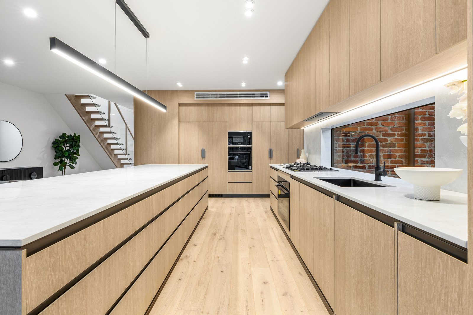 A showcase of elite architect design with lofty 2.7m squareset ceilings on both levels, streamlined Ezyjamb door frames and P50 shadow-line skirting boards, the home makes bold design statements at every turn from a part-cantilever feature stairway, to a towering entry rising through a skylit two-storey void. Designer detailed with light Oak floors meeting Coastal Oak cabinetry (including a bar and media unit), this is family living of rare sophistication with premium stone benchtops, loop-pile carpets and tall double-glazing... all behind a warm recycled brick and black-metal screened & concrete rendered façade.