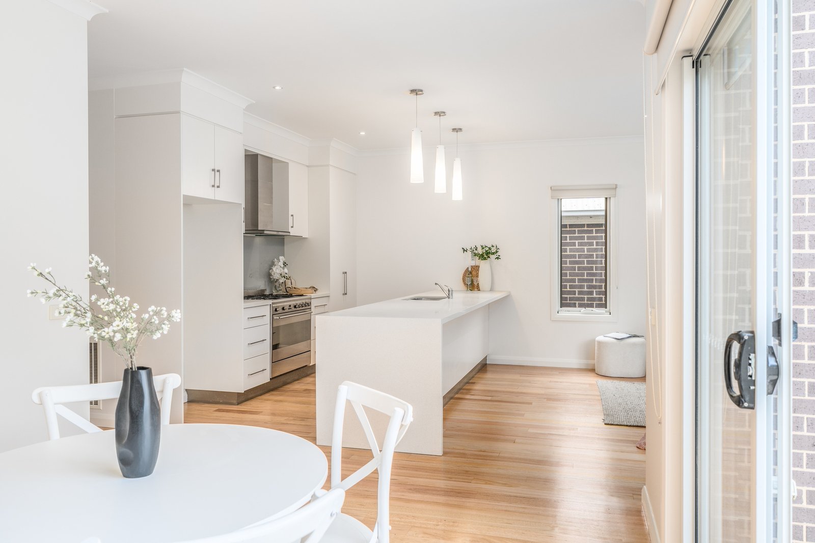 The rear of the home transitions to a spacious open plan kitchen, dining and living area, oriented to capture north facing natural light. The high-quality kitchen features waterfall stone benchtops, modern appliances including a 900mm oven and cooktop, rangehood, dishwasher, contemporary cabinetry and chic pendant lighting. The adjoining dining area opens up to a private courtyard, catering for seamless indoor-outdoor living and entertaining.