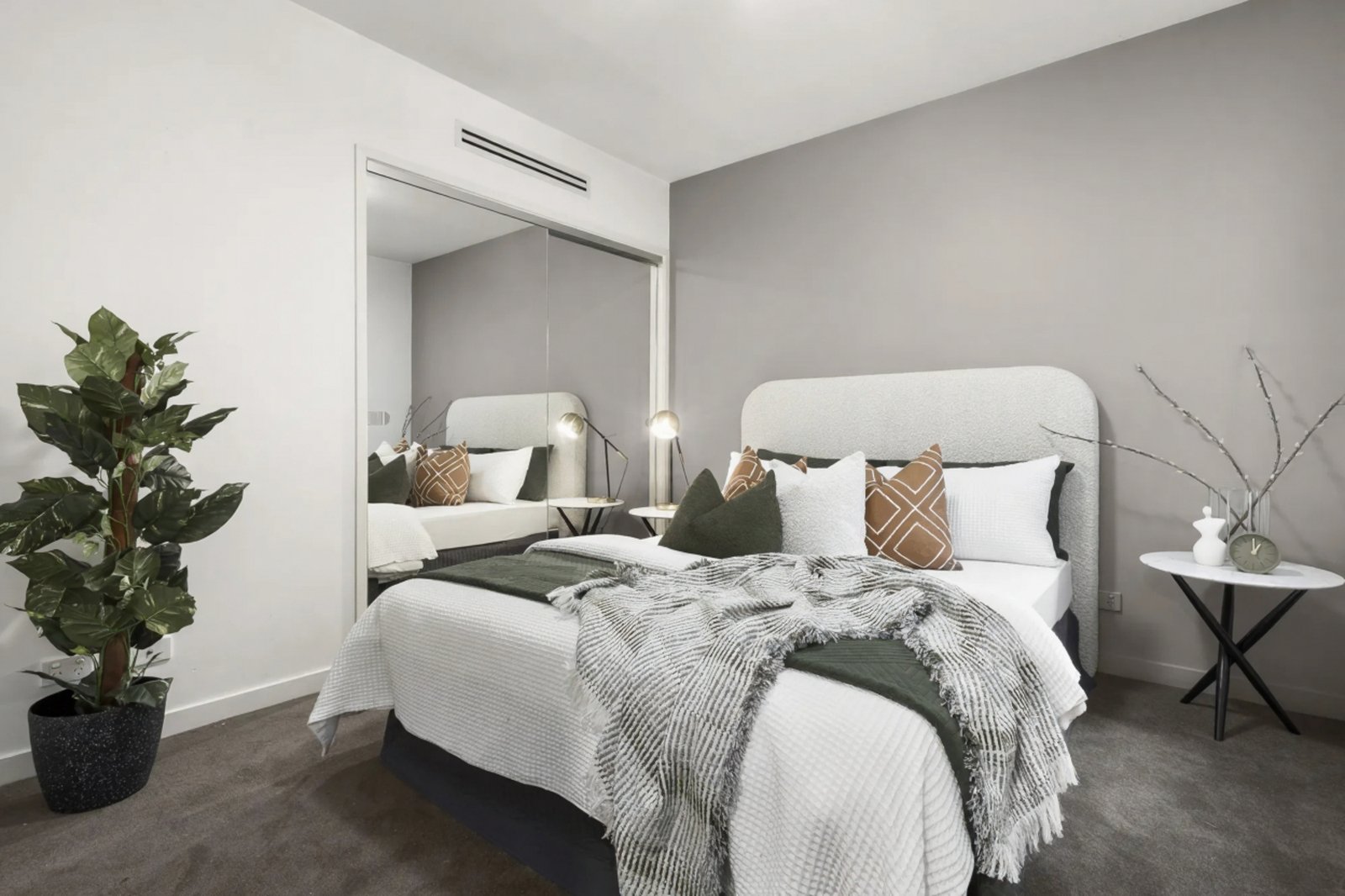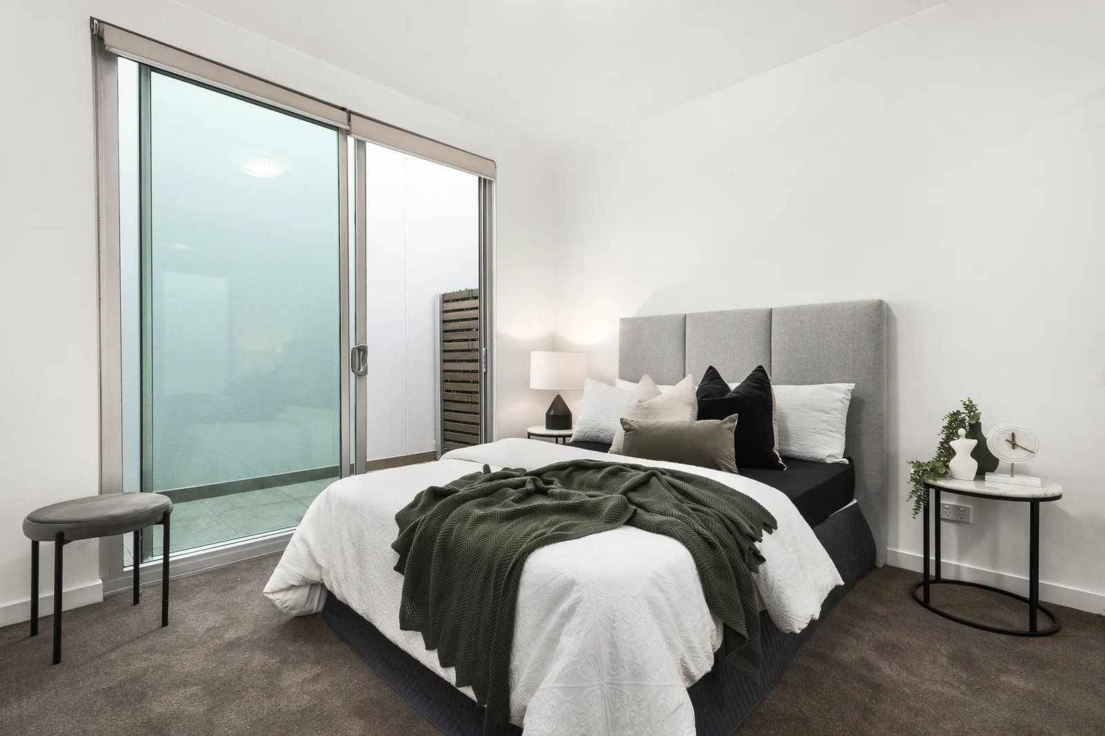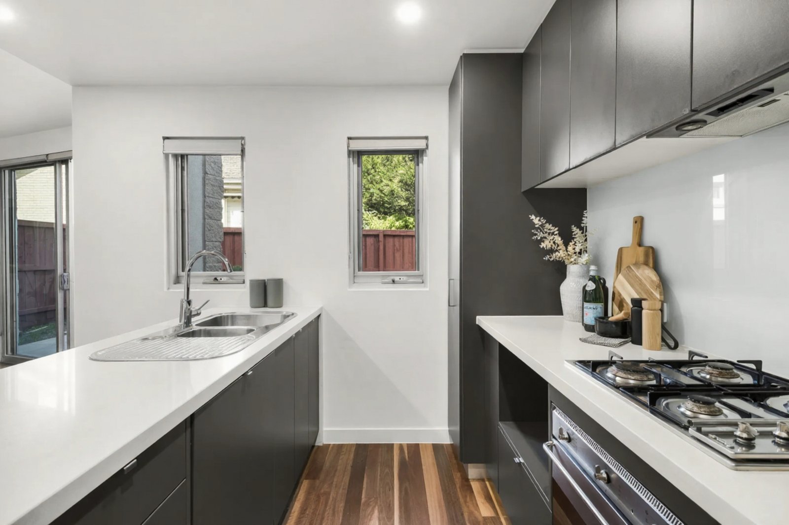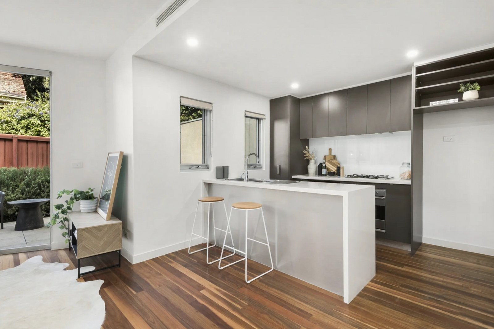 Tucked away at the rear of a boutique block of just 16, this two-bedroom residence is a quiet sanctuary designed for easy living. Light-filled bedrooms are cleverly arranged around a central atrium, while the open-plan living zone extends to a generous courtyard with paved entertaining space, lawn, and private rear gate access.