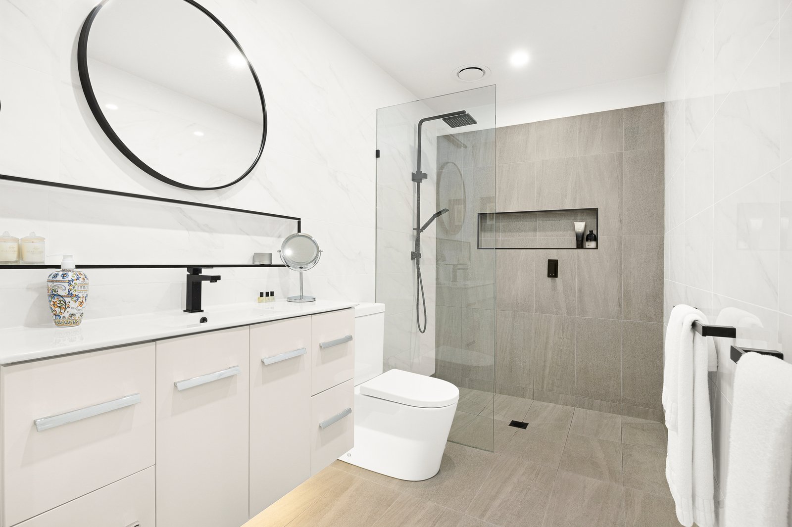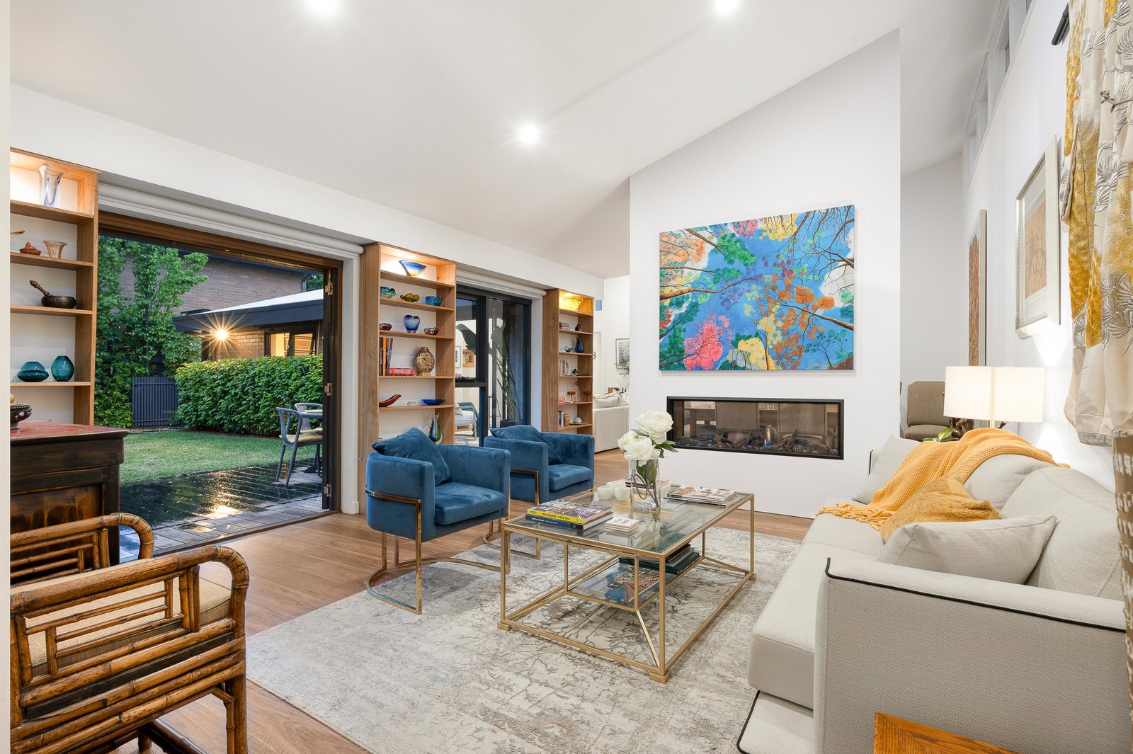 Two bedroom suites positioned at either end enhance privacy, each with bespoke joinery, designer ensuite and garden access. The main suite impresses with a wall of built-in robes and luxurious finishes including an underlit vanity, tiled storage niches and a dual-head rain shower. The double garage extends the home’s flexibility as a games room, studio or home office with floor tiles, heating and glass sliders opening to the garden.
