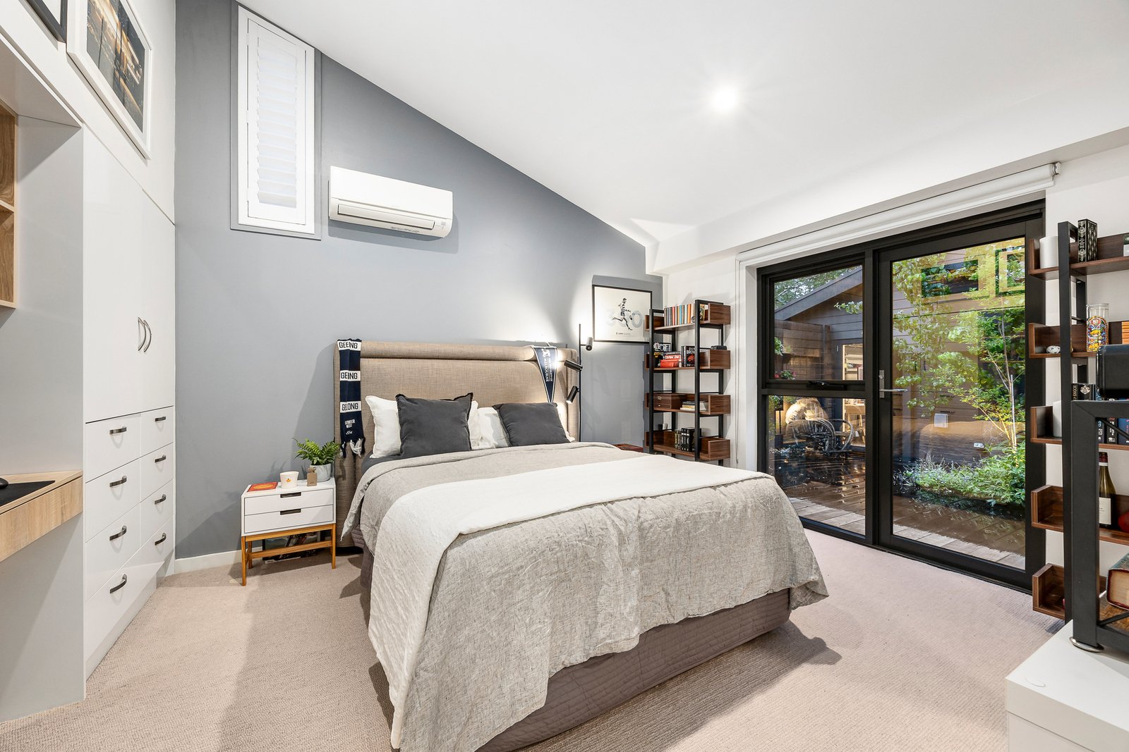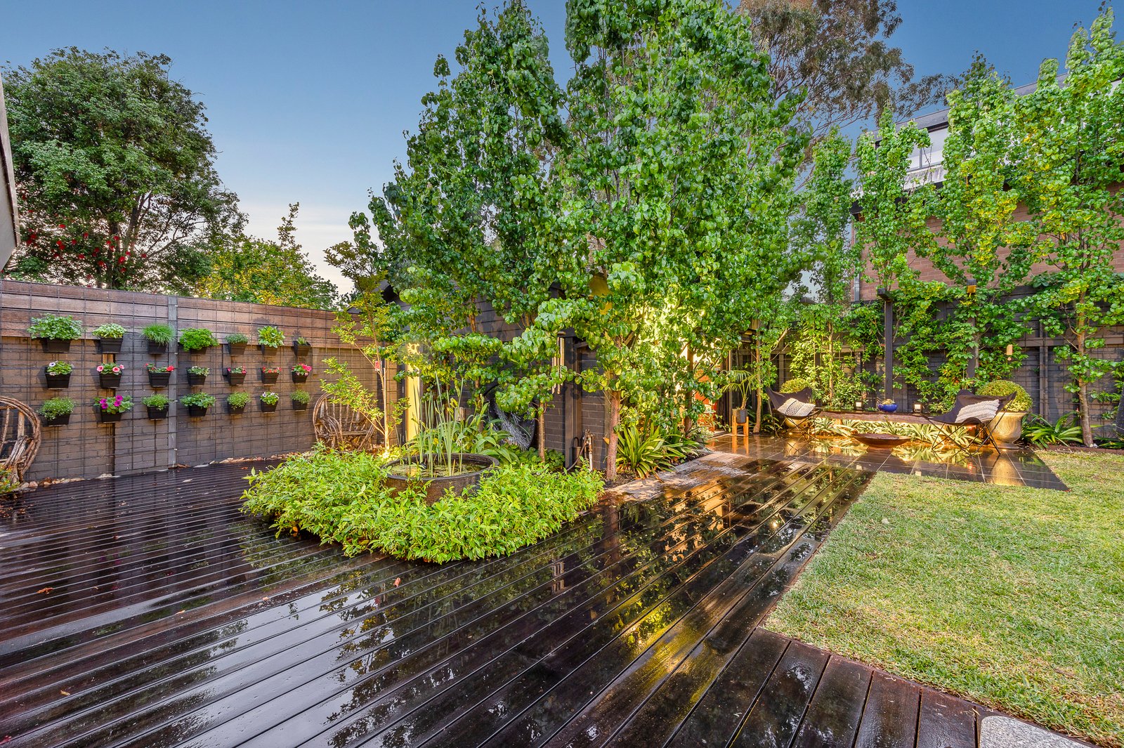 At its heart lies an exquisite garden oasis designed by Shay Robinson that feels worlds away. Beautifully layered with bleached timber decking, bluestone paving and lush greenery, the garden’s distinct zones flow effortlessly for relaxation and entertaining. A vertical garden and tranquil pond form a soothing backdrop, complemented by bench seating, a hide-away spa and ambient lighting that brings the garden to life after dark.