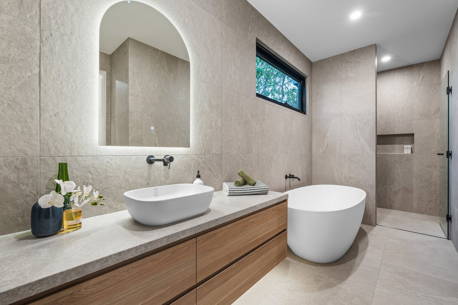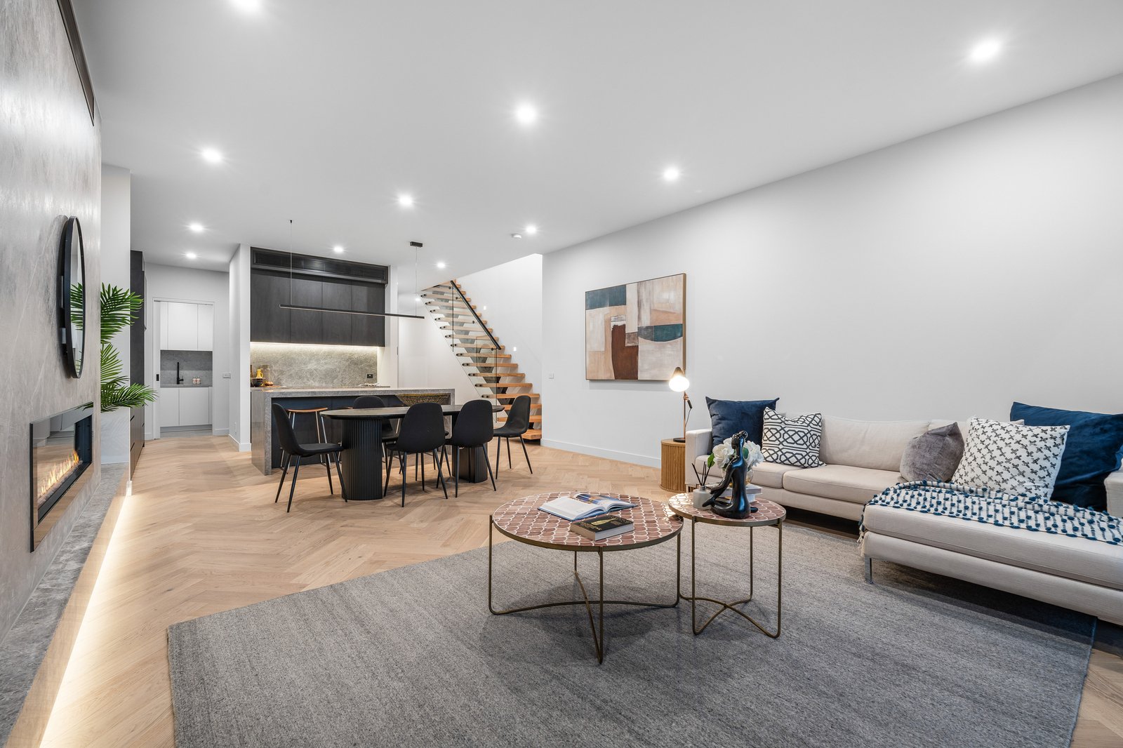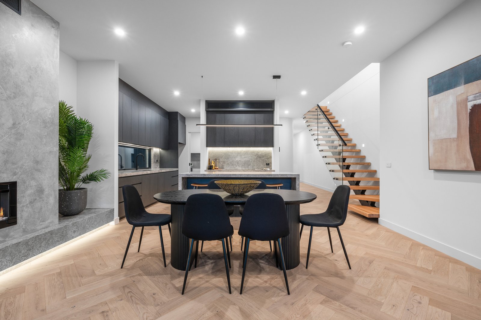 Making bold design statements at every turn from the stone-wrapped bench and integrated appliances (including 900mm induction cooktop) of the prestige Bosch kitchen, to the sculptural open-tread stair linking the levels, the home goes beyond fashion with finishes to last a lifetime including a hand-painted marble-finish feature wall to match the benchtops, and luxe floor-to-ceiling tiled bathrooms with concealed-cistern WCs, floating vanities and an egg-bath.