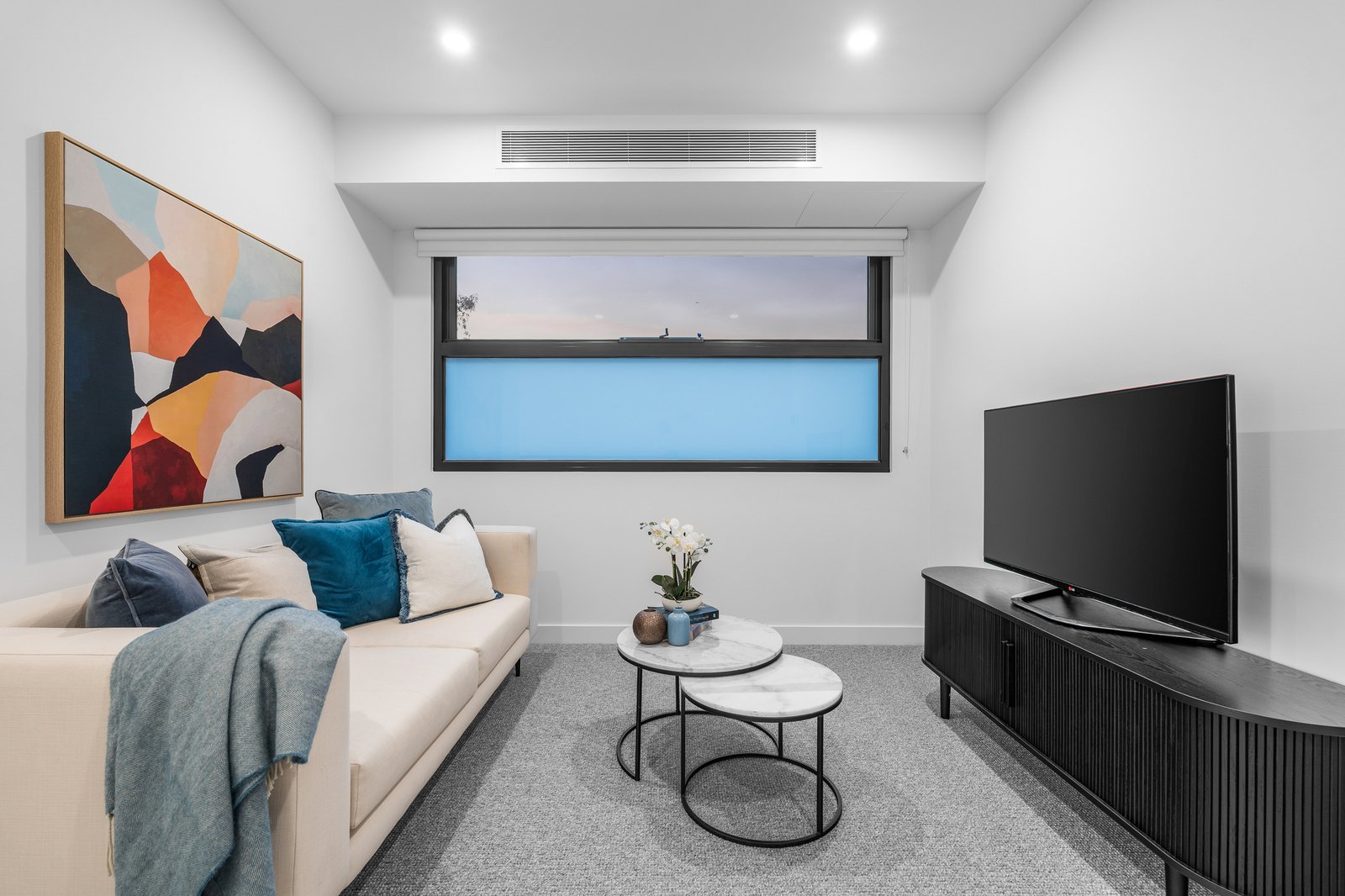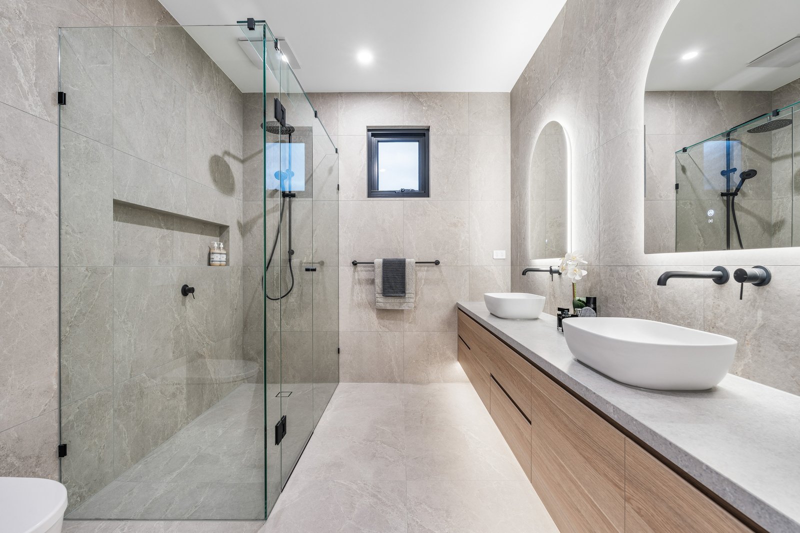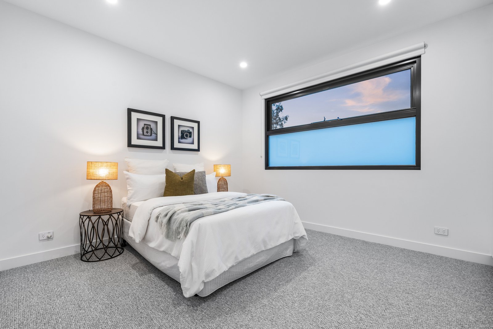 Making bold design statements at every turn from the stone-wrapped bench and integrated appliances (including 900mm induction cooktop) of the prestige Bosch kitchen, to the sculptural open-tread stair linking the levels, the home goes beyond fashion with finishes to last a lifetime including a hand-painted marble-finish feature wall to match the benchtops, and luxe floor-to-ceiling tiled bathrooms with concealed-cistern WCs, floating vanities and an egg-bath.