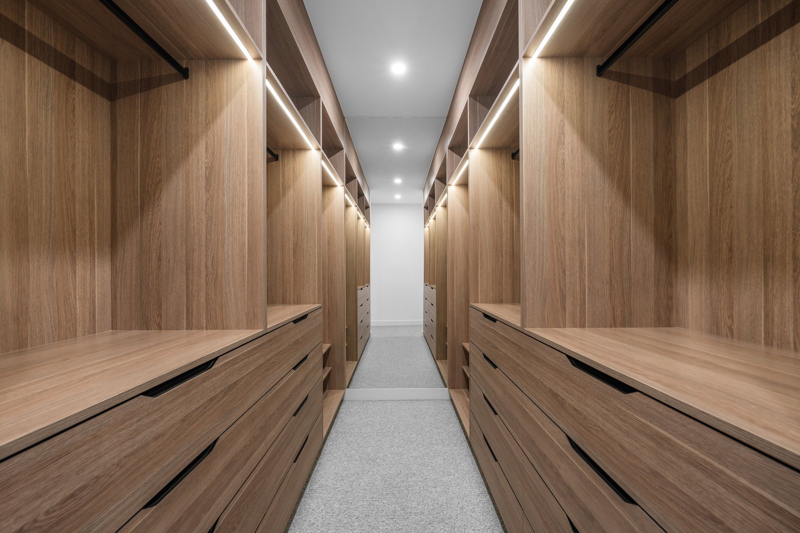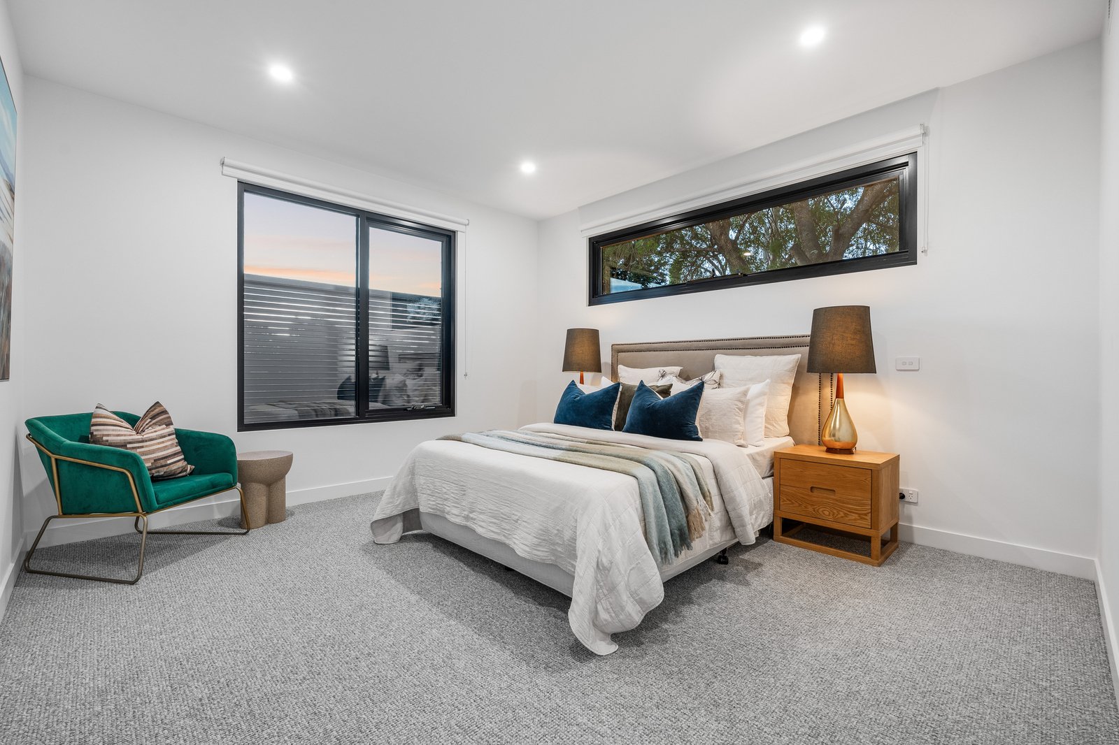 Styled with herringbone European Oak floors plus heavy-duty pebbled carpets, natural Grey Tundra Marble and hard-wearing engineered-stone benchtops on custom Polytech cabinetry, the home’s demanding architectural specification features up to 3m squareset ceilings, subtle LED strip lighting for all wet-areas, and high-end window-furnishings - including stylised tracked sheers (for principal living and both suites) plus electric blinds (for living) – all on commercial double-glazed aluminium windows.