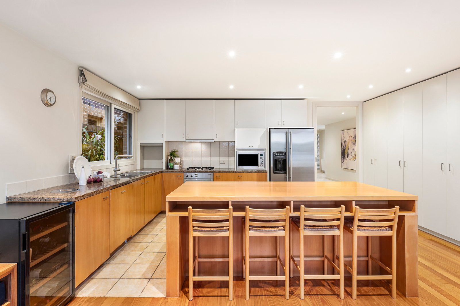 The granite-finished kitchen and casual meals area enhance everyday functionality with a central island breakfast bar, Miele appliances and abundant custom cabinetry, complemented by a well-appointed laundry and guest powder room.