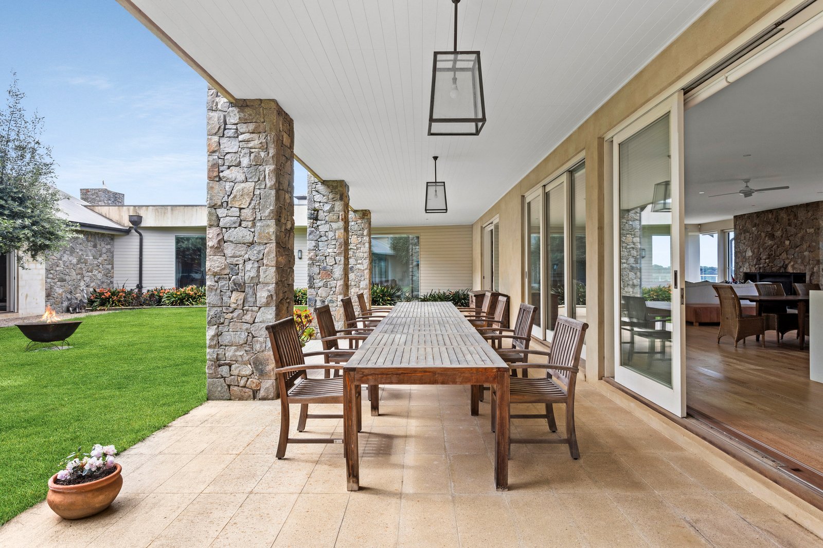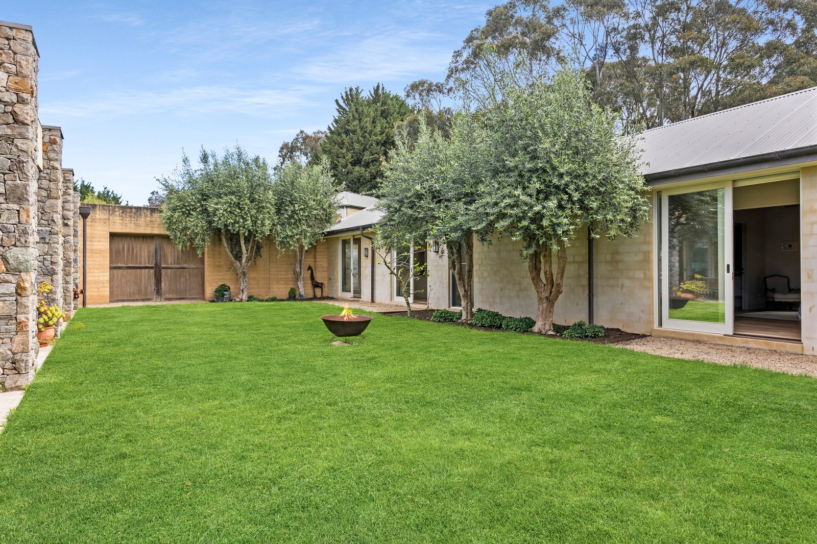 Libby Thornton interiors evoke clean lines and a minimalist sensibility throughout the primary entertaining spine, where ground Italian stone makes a striking impression in the sublime kitchen with a butler’s pantry. A monumental open fireplace framed by locally sourced stacked stone brings warmth in the cooler months, while operable glass on both sides allows an effortless cross-breeze, dissolving the threshold between kitchen, eastern deck and courtyard, creating a natural flow for entertaining amid rammed earth textures and olive trees, with a cedar-lined cellar nearby keeping the finest vintages close at hand.