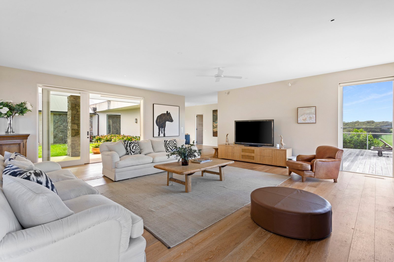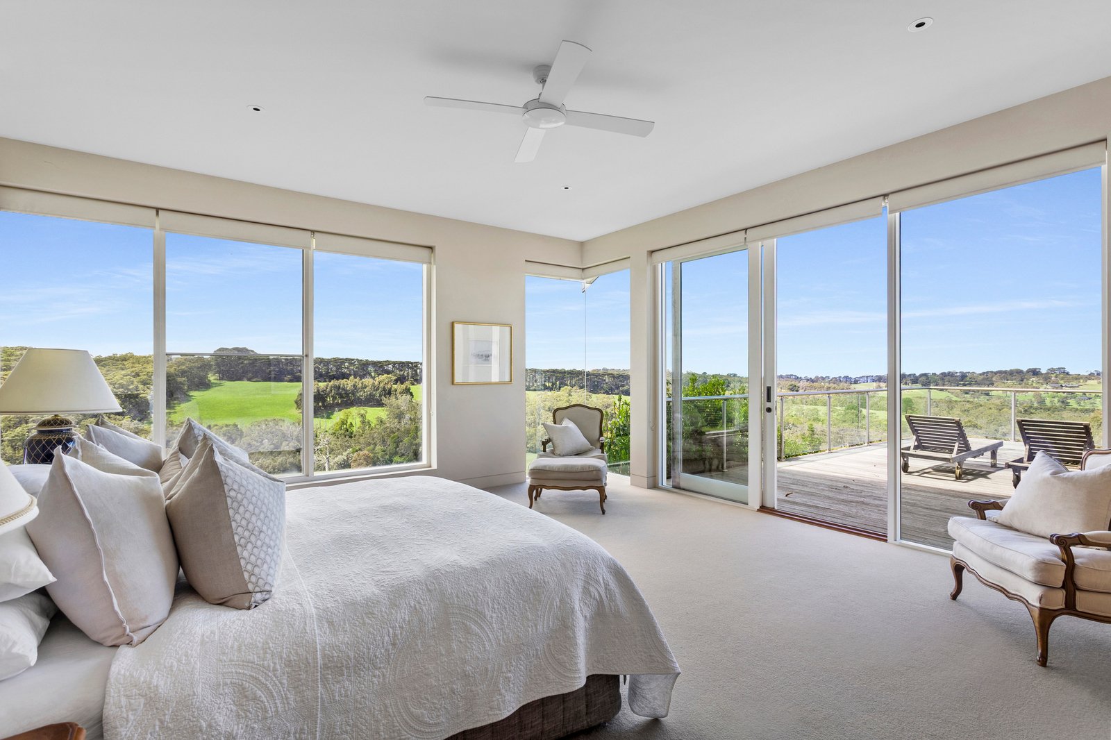 Four exceptionally spacious bedrooms extend across the single level, headlined by a primary suite immersed within the landscape through its corner glazing and full-height glass that continues into the ensuite, with a dressing room and balcony access. Three additional bedrooms include a secondary suite in the same wing as a generous family bathroom and fireside lounge. Adding to the allure, a self-contained one-bedroom apartment crowns the garage with private access affording flexibility for guests, multi-generational living or short-stay accommodation.
