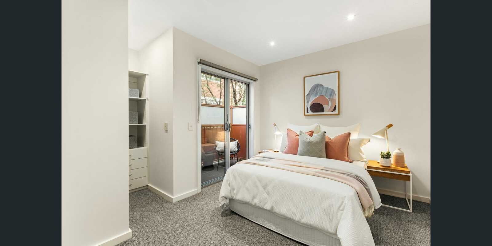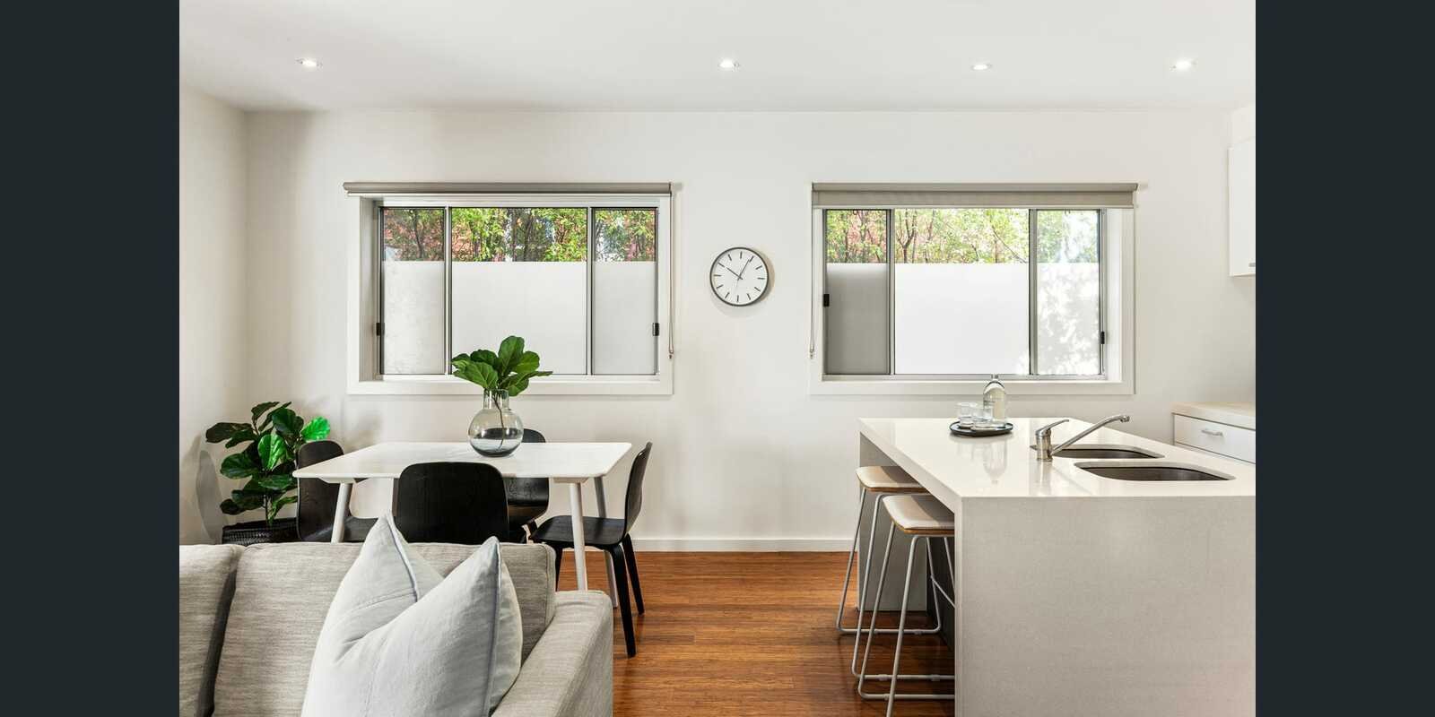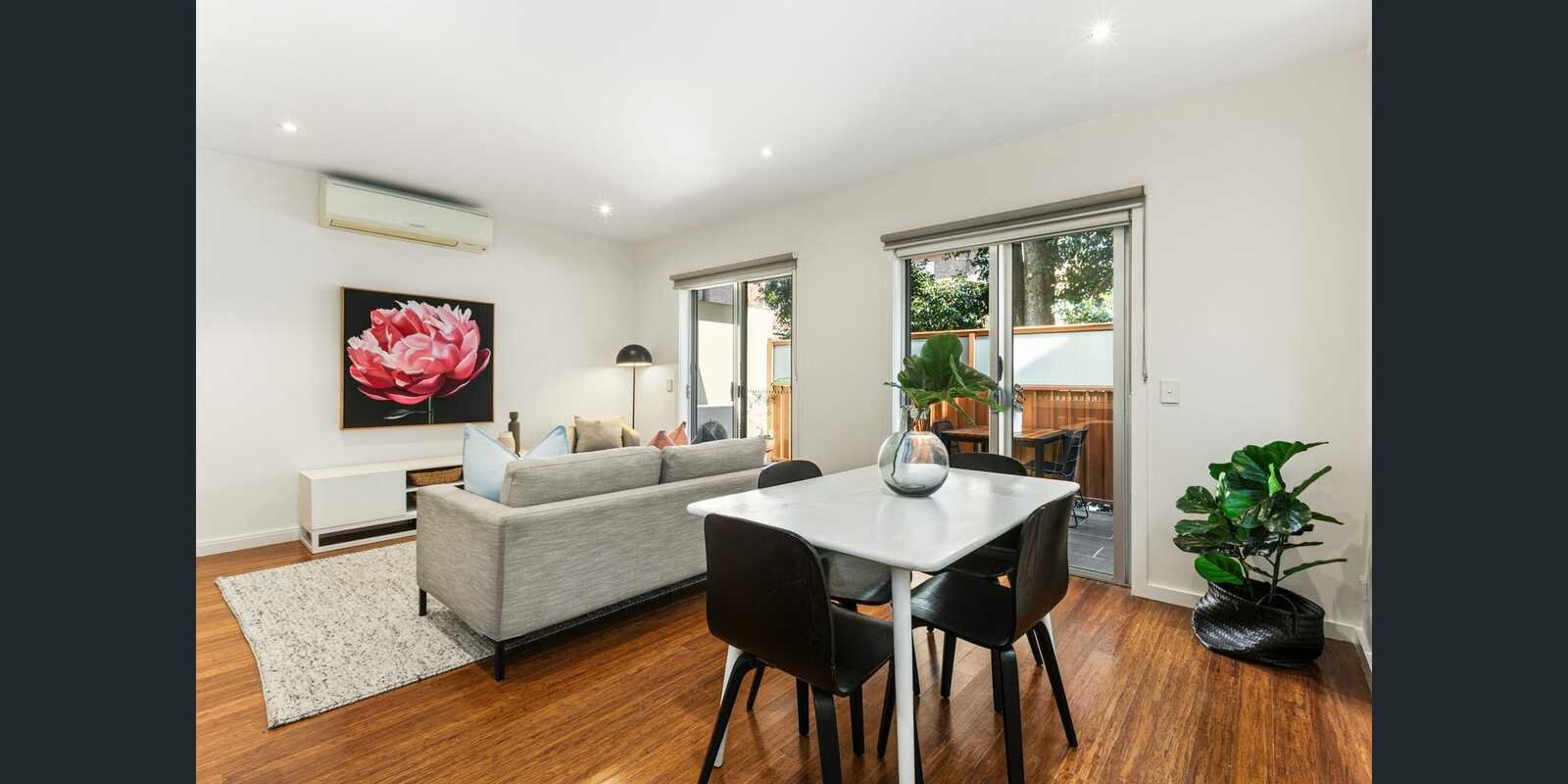 Tucked peacefully at the rear and impressively sized, this stylish two-bedroom, two-balcony apartment delivers effortless living and unbeatable convenience right in the heart of vibrant Alma Village. Step inside to discover a sleek chef’s kitchen featuring a waterfall-edged island bench, stone surfaces, soft-closing cabinetry, and premium Smeg appliances. The open-plan living and dining zone is bathed in natural light and flows onto a generous balcony framed by leafy privacy - perfect for entertaining or unwinding.