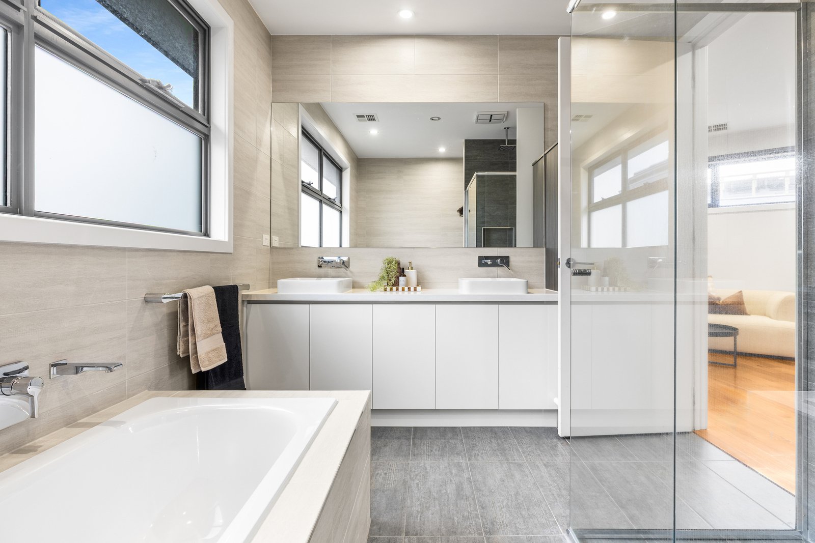 A lavishly large main master suite is pampered by a walk in robe and a twin ensuite with full height tiles. While two further robed bedrooms are paired with a matching family bathroom with tub and a ground floor master is paired with its own ensuite. This unique home also features a double garage with internal access and ducted climate control.