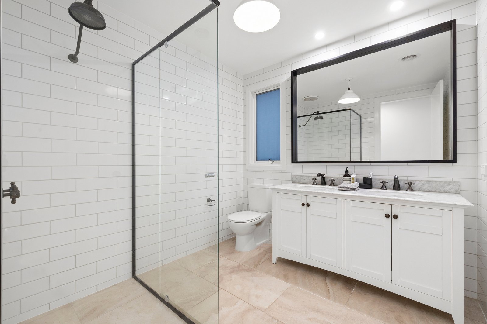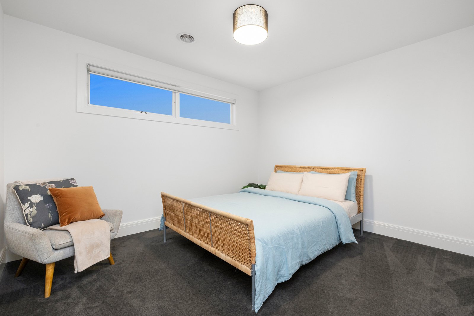 All four bedrooms are tucked away upstairs, including the street-view primary bedroom with lavish ensuite, walk-in robe and peaceful reading nook. Built-in robes feature in all three remaining bedrooms – they share a designer bathroom with freestanding bath, matte black fixtures and chic marble-topped vanity.