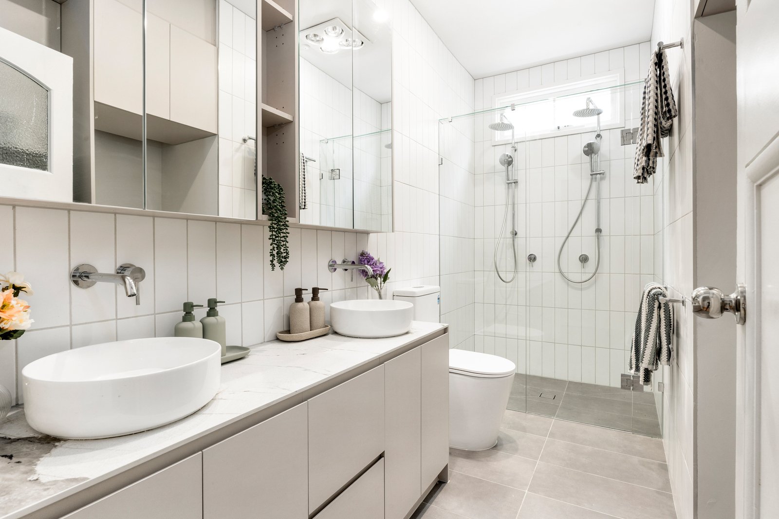 A traditional arched hallway links together two impressively spacious bedrooms with original high ceilings, now with excellent integrated BIRs, before the new designer bathroom adds the luxury of a double shower, double vanity and extensive storage to everyday self-care. Beyond, light filled open plan living areas include a house-sized stone kitchen with central island dining/entertaining and French doors that unfold to a larger-than-expected courtyard garden. Here, a wind-out sun awning and extensive paving are perfectly suited to private entertaining in leafy surroundings, whilst a remote roller door creates the option for secure parking via the rear ROW.
