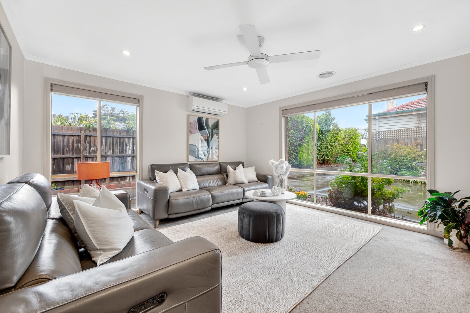 Comprises a lavishly large and light lounge room with a northern aspect that flows through to a dining room opening onto the decked alfresco and gardens. Overlooked by a tasteful kitchen with dishwasher, gas cooking and terrific storage. The bedroom wing hosts a well-separated master as well as two further bedrooms served by a renovated bathroom with tub and a walk-in shower, as well as an additional powder room and separate laundry with service yard access. Also features a garage plus parking for one more, RC/AC and ducted heating for your comfort.