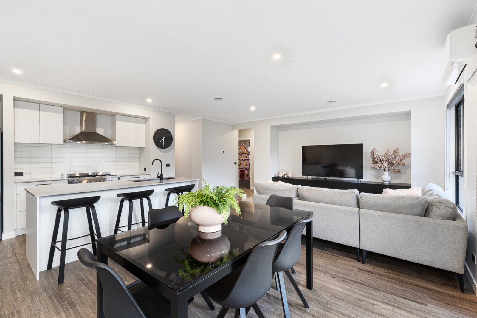 Step inside and be greeted by a light-filled open plan design that instantly feels inviting. The spacious living, kitchen, and dining area provides the perfect hub for family life, with plenty of room to relax and entertain. The stylish kitchen features stone benchtops, a 900mm gas cooktop, double sink, and a walk-in pantry — ideal for those who love to cook and entertain with ease.