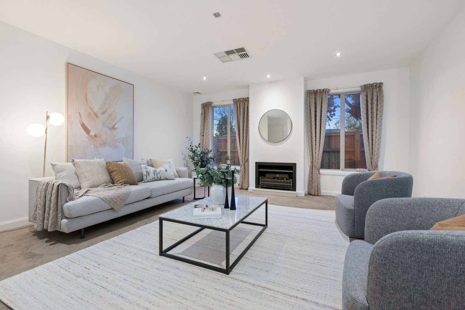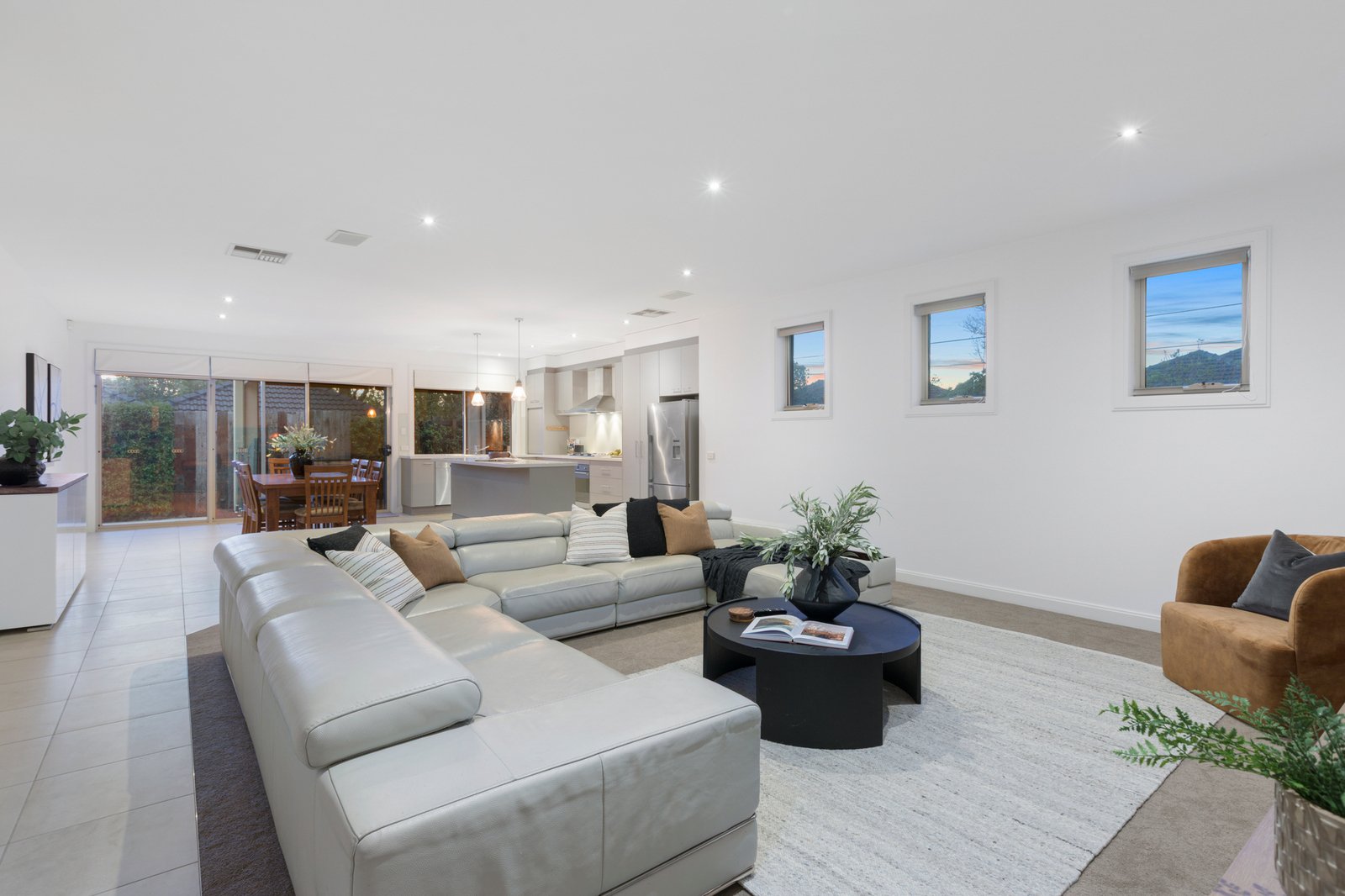 The formal lounge, anchored by a gas fireplace, offers a serene retreat for quiet evenings or intimate gatherings. Beyond, the expansive living room is bathed in northern light - a natural hub for daily life, while the sun-soaked dining area opens through sliding glass doors to an undercover deck with cafe blinds and heaters, designed for all-season entertaining.