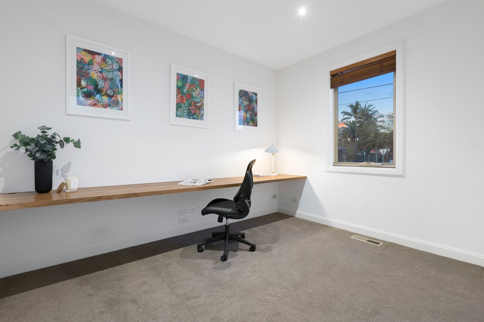 A tiled entrance hall beneath high ceilings creates an inviting interlude before interiors unfold in generous dimension. A substantial study or home office, with a custom fitted workspace, enjoys leafy garden outlooks - ideal for home workdays or equally as a fifth bedroom with excellent storage.