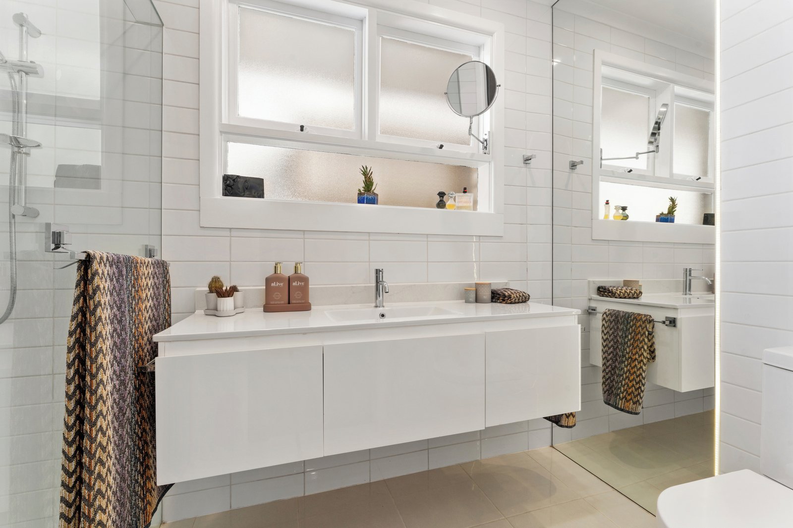 Three generous bedrooms, two with built-in robes, are serviced by a sleek modern bathroom with rainfall shower plus the added convenience of a central powder room/second WC. Comfort is assured with zoned ducted heating and cooling, while dark stained timber floors, clever storage solutions, and superb natural light elevate the home’s interior appeal.