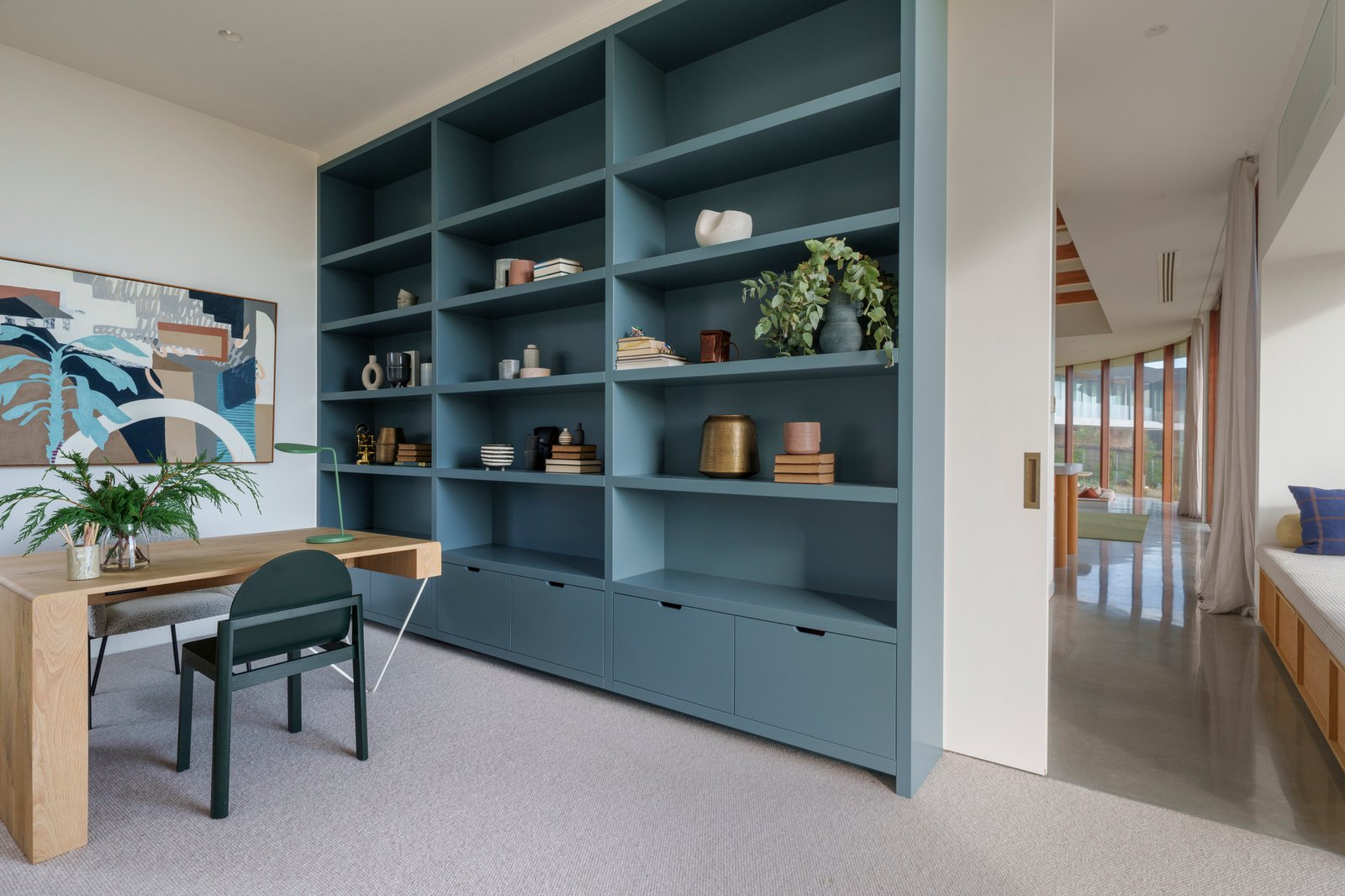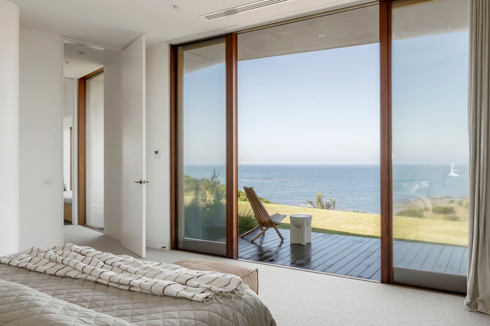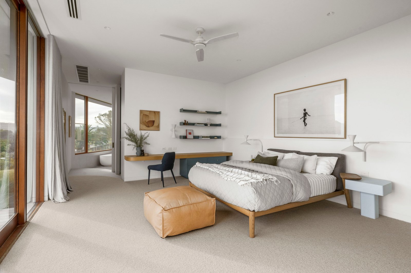 The main suite is a private haven - a sanctuary with a custom walk-in robe, ocean-view ensuite, and adjoining library or study with a window seat perfectly poised to watch the tide’s rhythm. Here, time slows, and calm takes over.