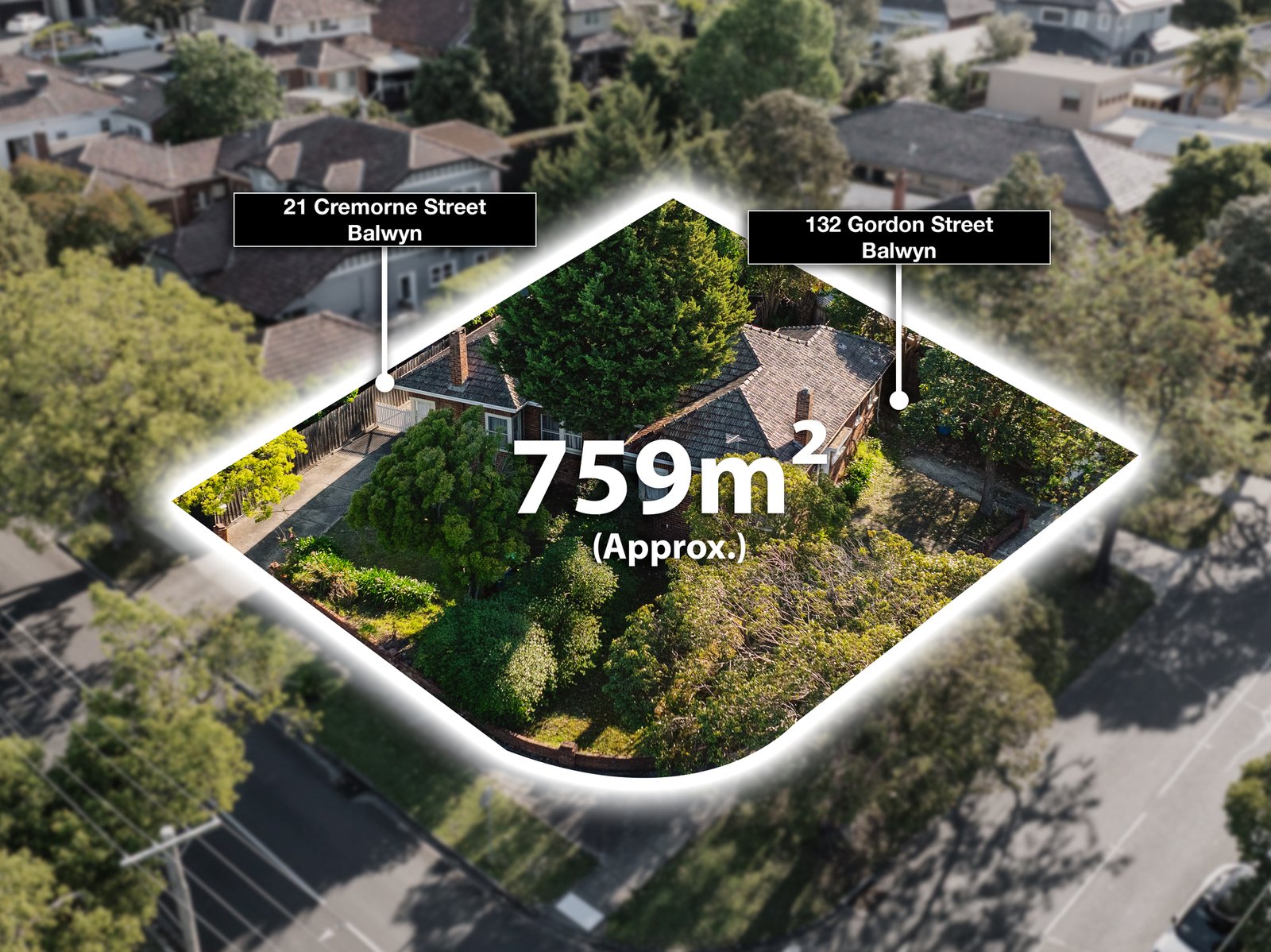 Selling two titles of 21 Cremorne St and 132 Gordon St Balwyn as one property, a rare opportunity to secure two semi-detached homes on a prominent corner allotment of approx. 759sqm, perfectly positioned within the Balwyn High School zone and the highly sought-after Balwyn pocket mile — celebrated for its beautiful tree-lined streets, quality neighbours, and timeless family appeal.