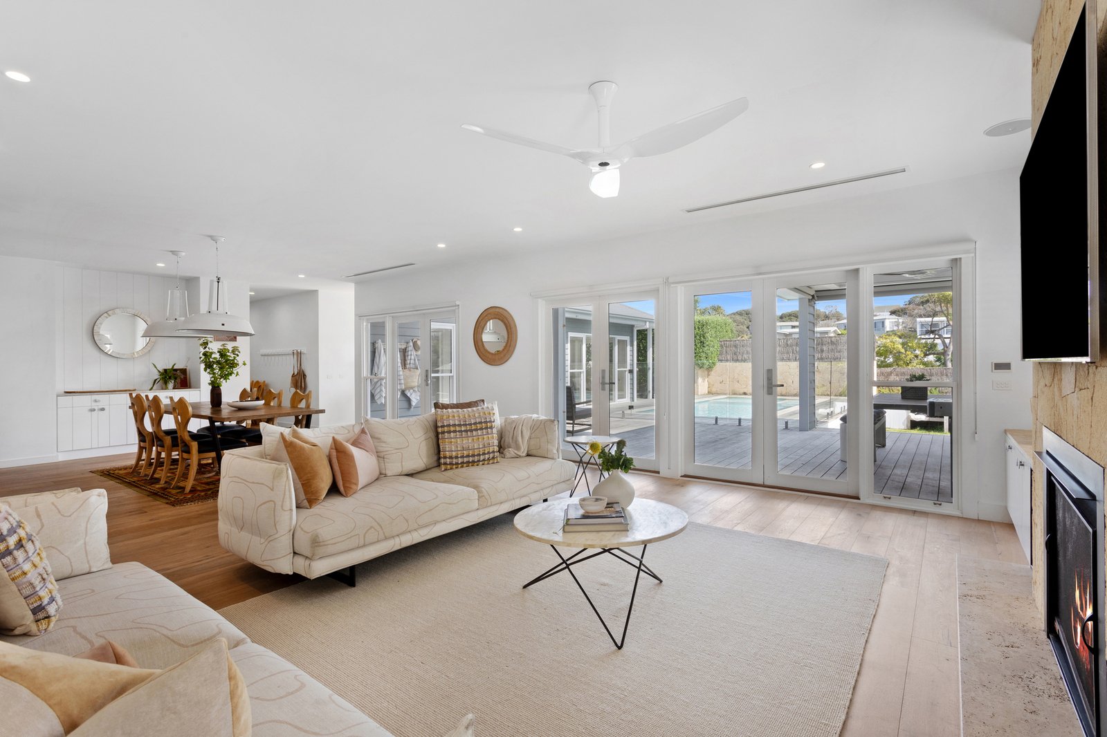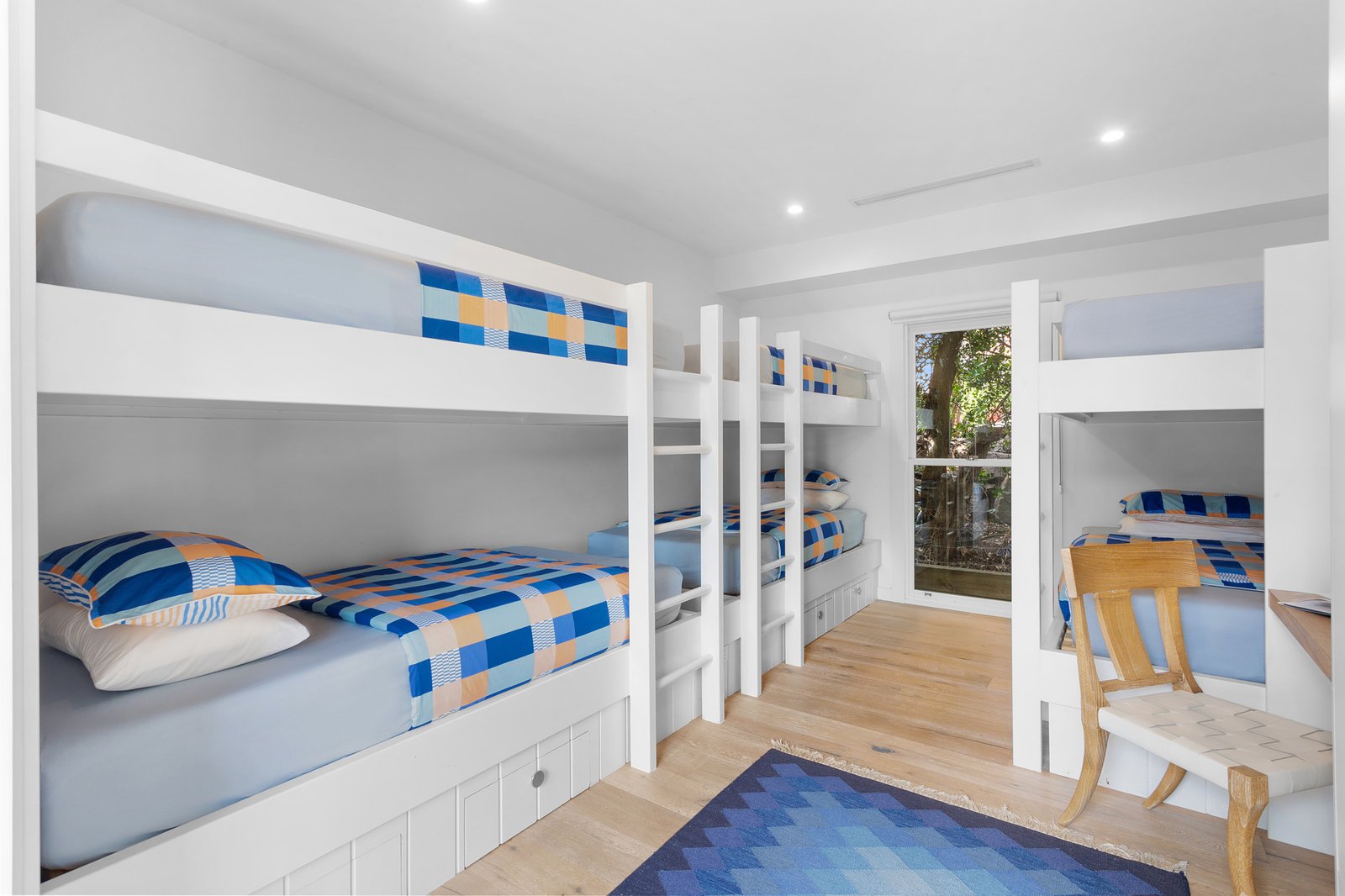 Two distinct zones offer flexibility for families, one centred on the open fireplace and social for those long coastal afternoons, the other tucked to the rear, great as a kids’ retreat. The kitchen’s stone surfaces and timber accents add an organic warmth, complemented by quality appliances and excellent storage, including a large butler’s pantry, making it equally suited to weekend escapes or extended summer stays. The four spacious bedrooms include a custom bunk room to the rear, all accompanied by three beautifully detailed bathrooms, including the main bedroom’s ensuite.