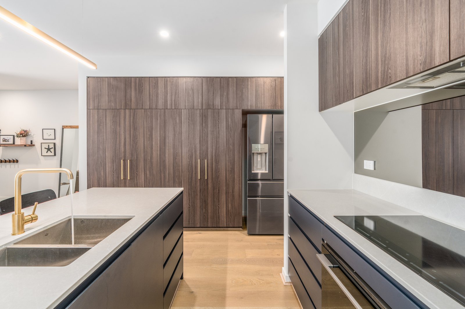 The contemporary façade sets the tone for the home’s sleek and sophisticated design. Inside, the entry leads to an open plan kitchen, dining and living area featuring light interiors, square set ceilings, beautiful engineered oak flooring, and floor to ceiling sheers, showcasing the elegant style of the interiors. The high-end kitchen features stone benchtops, quality Fisher & Paykel cooking appliances including 900mm oven, induction cooktop, stainless steel dishwasher, generous storage provisions, chic brass tapware and elegant pendant lighting.