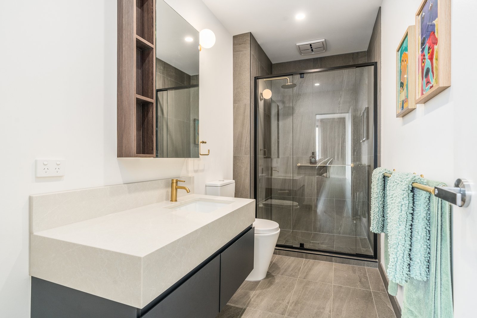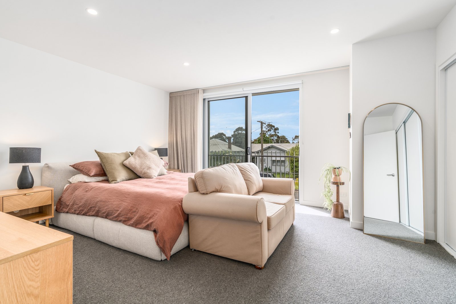 Upstairs, the luxurious main bedroom enjoys direct access to a private juliet balcony, fitted with built-in robes and a tastefully presented ensuite with spacious shower, floor to ceiling tiles, modern vanity, mirror cabinet and modern sconce lighting. Two additional bedrooms feature direct access to a second balcony, both include built-in robes, serviced by a central bathroom with bath and separate shower, continuing in the quality finishes of the home.