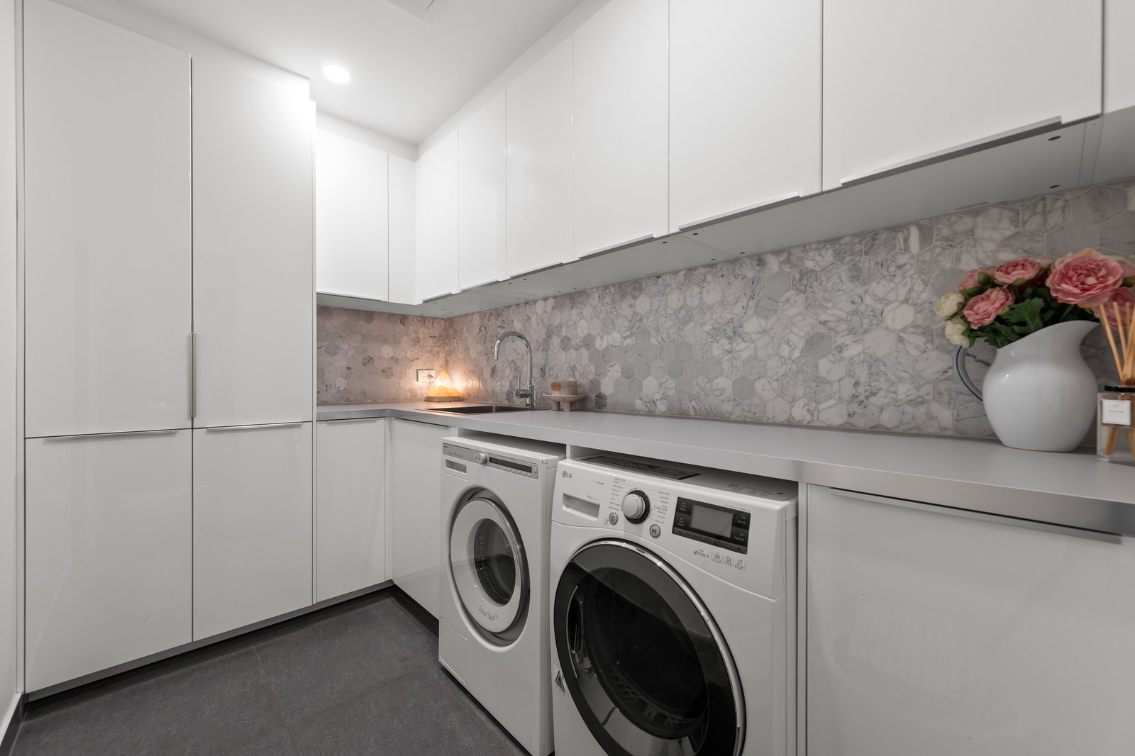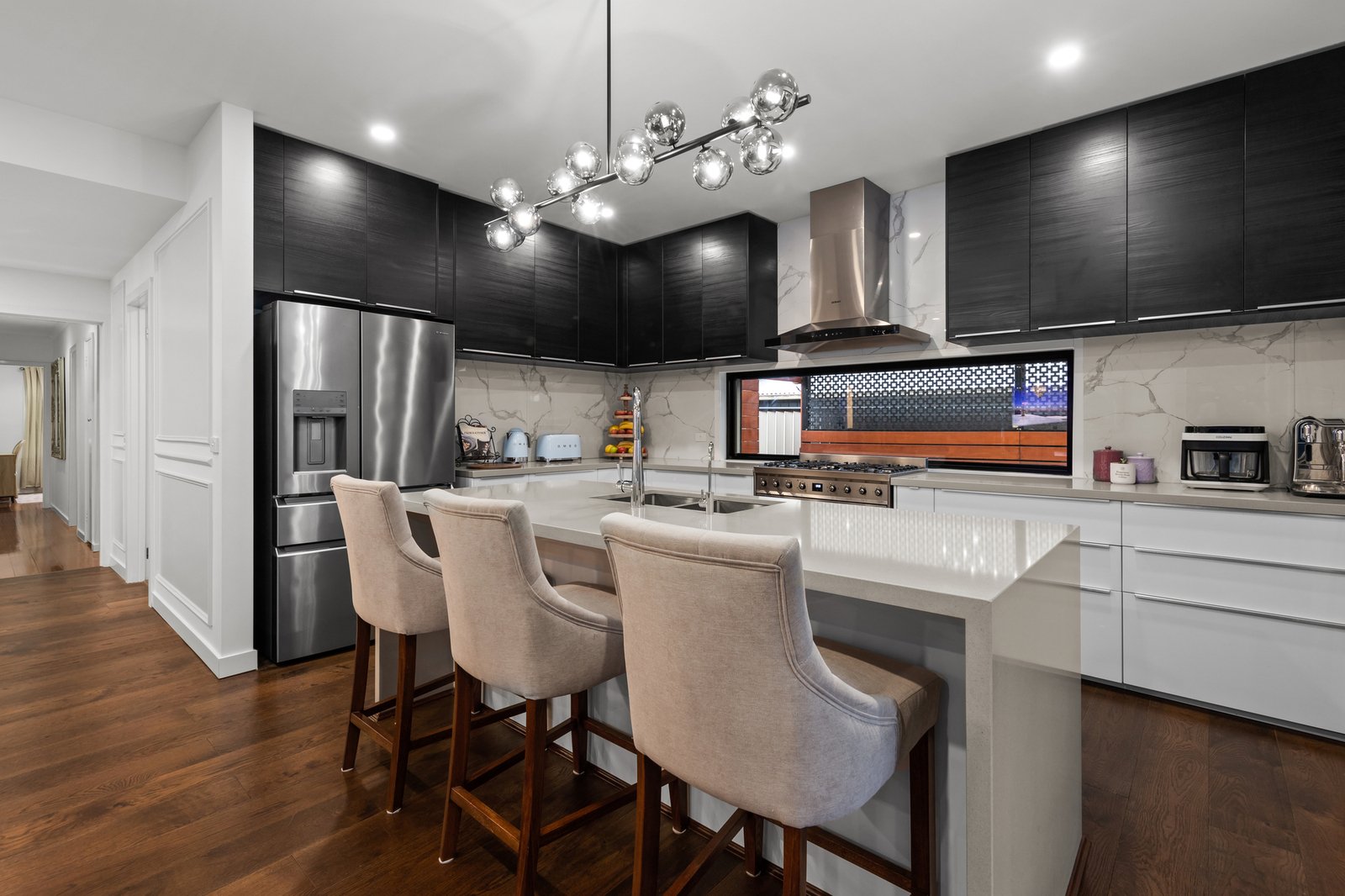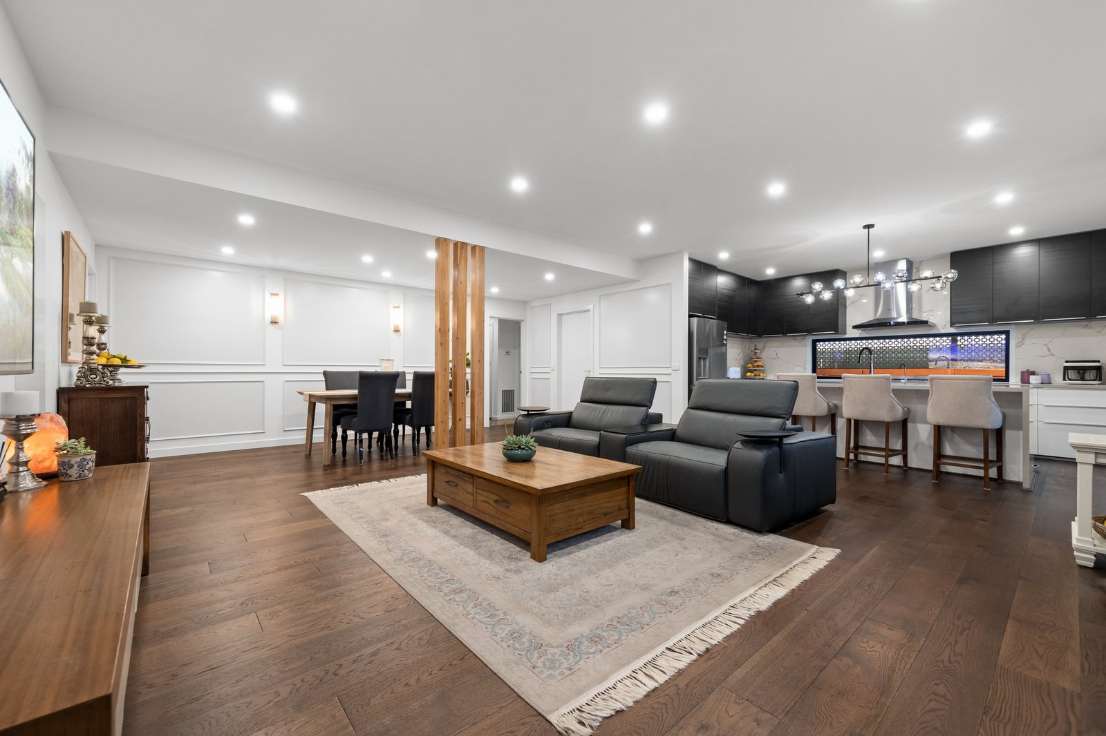 At the heart of the home is a contemporary kitchen that will delight any home chef, featuring stone benchtops, a Smeg oven and stove, Robam rangehood, and an Asko dishwasher, perfect for effortless meal prep and gourmet cooking. Flowing seamlessly into the dining and family areas, this open-plan layout forms the vibrant social hub of the home.