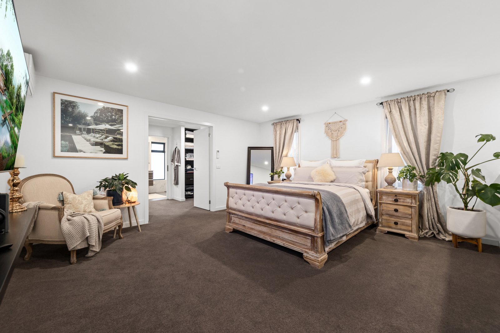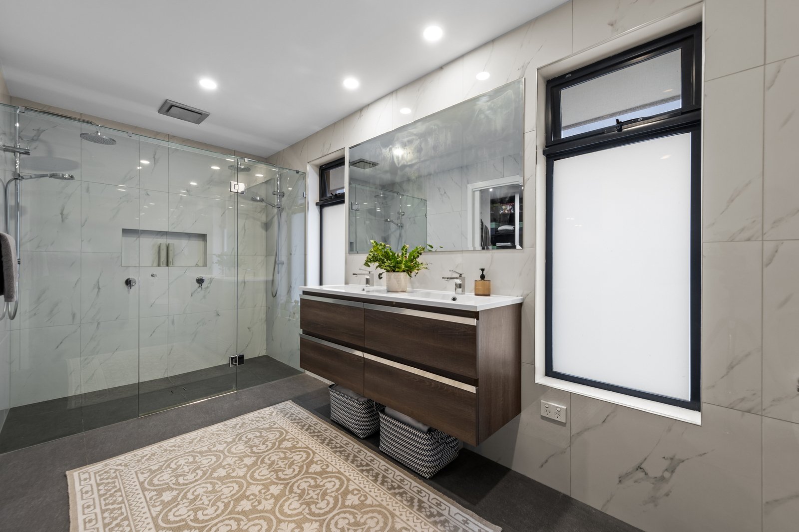 Accommodation is thoughtfully designed with an oversized master suite boasting his and hers walk-in robes and a generous ensuite. Four additional ground-floor bedrooms, each with built-in robes, are serviced by two sleek bathrooms, ensuring comfort and privacy for the whole family.