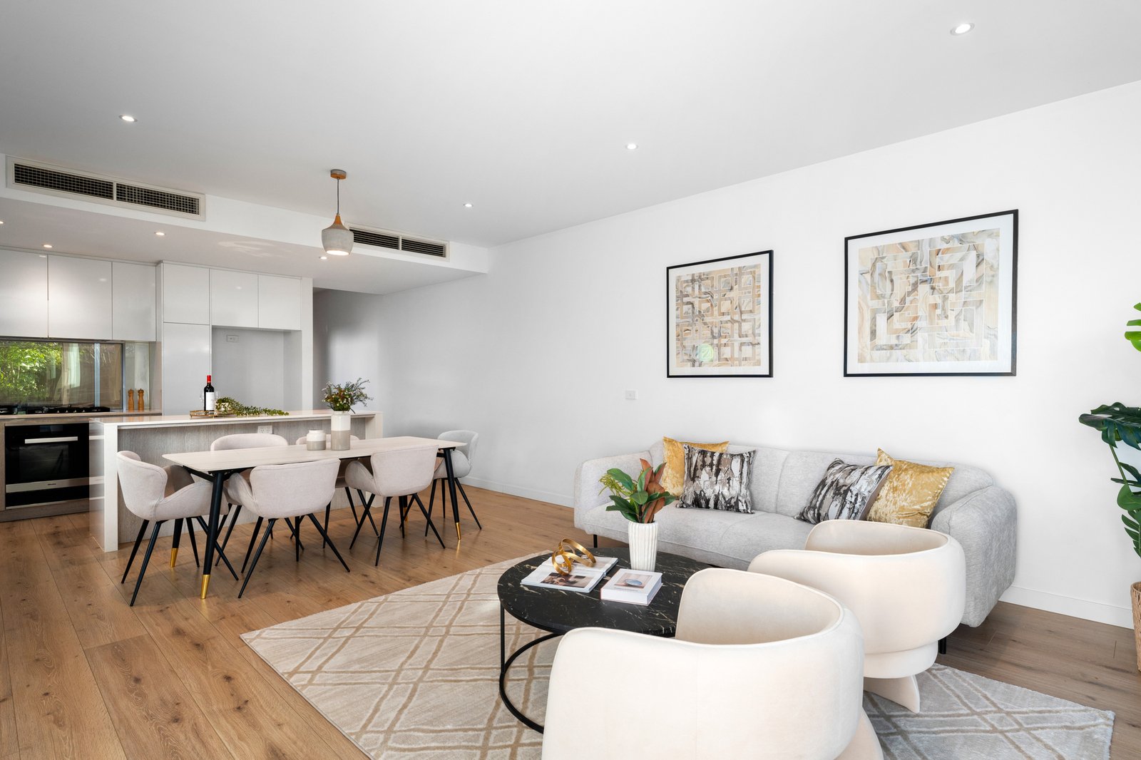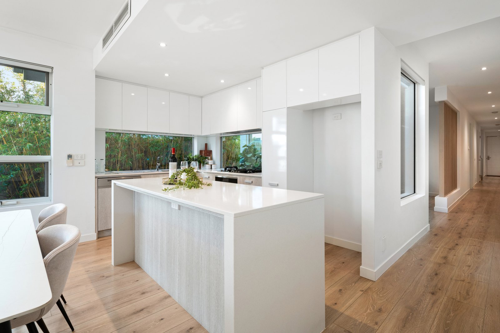 A slatted timber divider creates a natural flow into the relaxed lounge, where a subtle architectural pause between kitchen and living invites ambient styling and balance—echoing feng shui principles. The stone kitchen is appointed with premium Miele appliances and a central island bar, overlooking the open-plan living and dining zone designed to accommodate a gas fireplace.