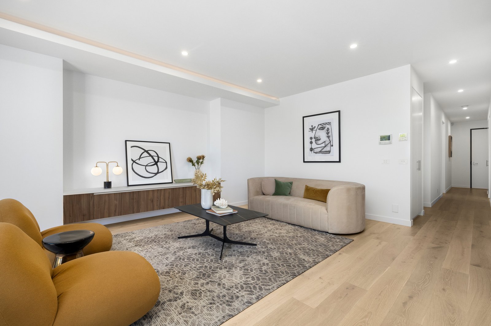 Security and peace of mind are assured with video intercom, alarm system and secure basement parking for two cars with lift access and additional storage. A showcase of sustainable sophistication, this residence achieves an impressive 8+ star NatHERS rating through advanced green architecture, including high-performance glazing and 2.6kW solar system.