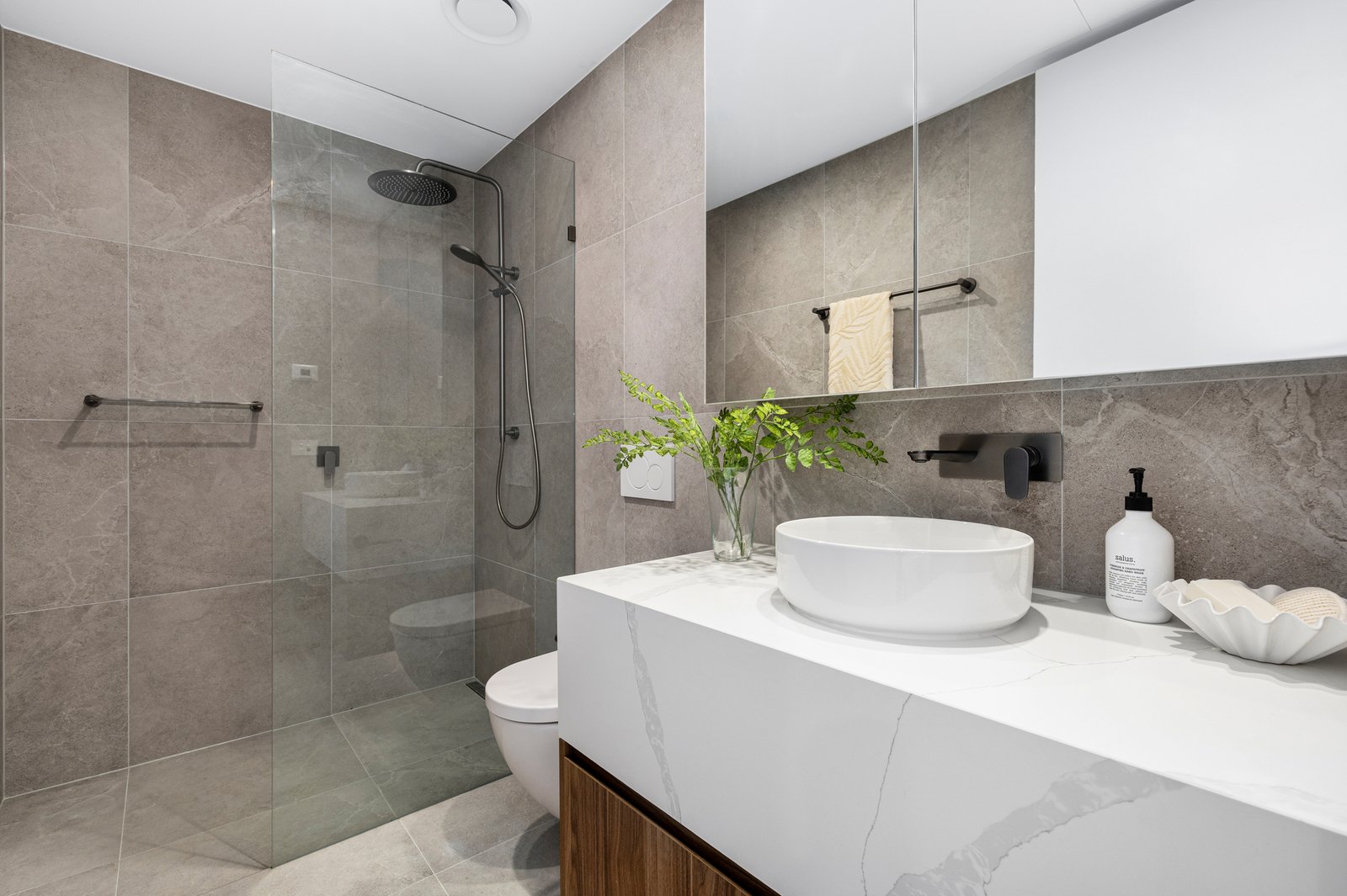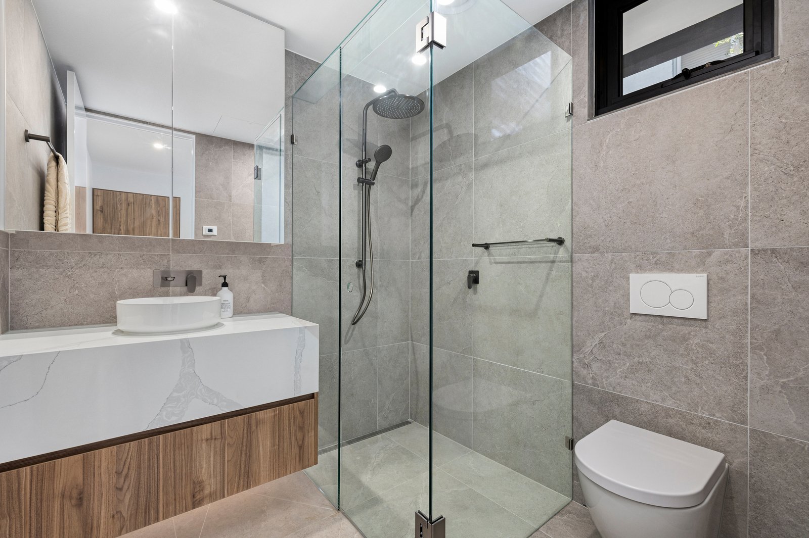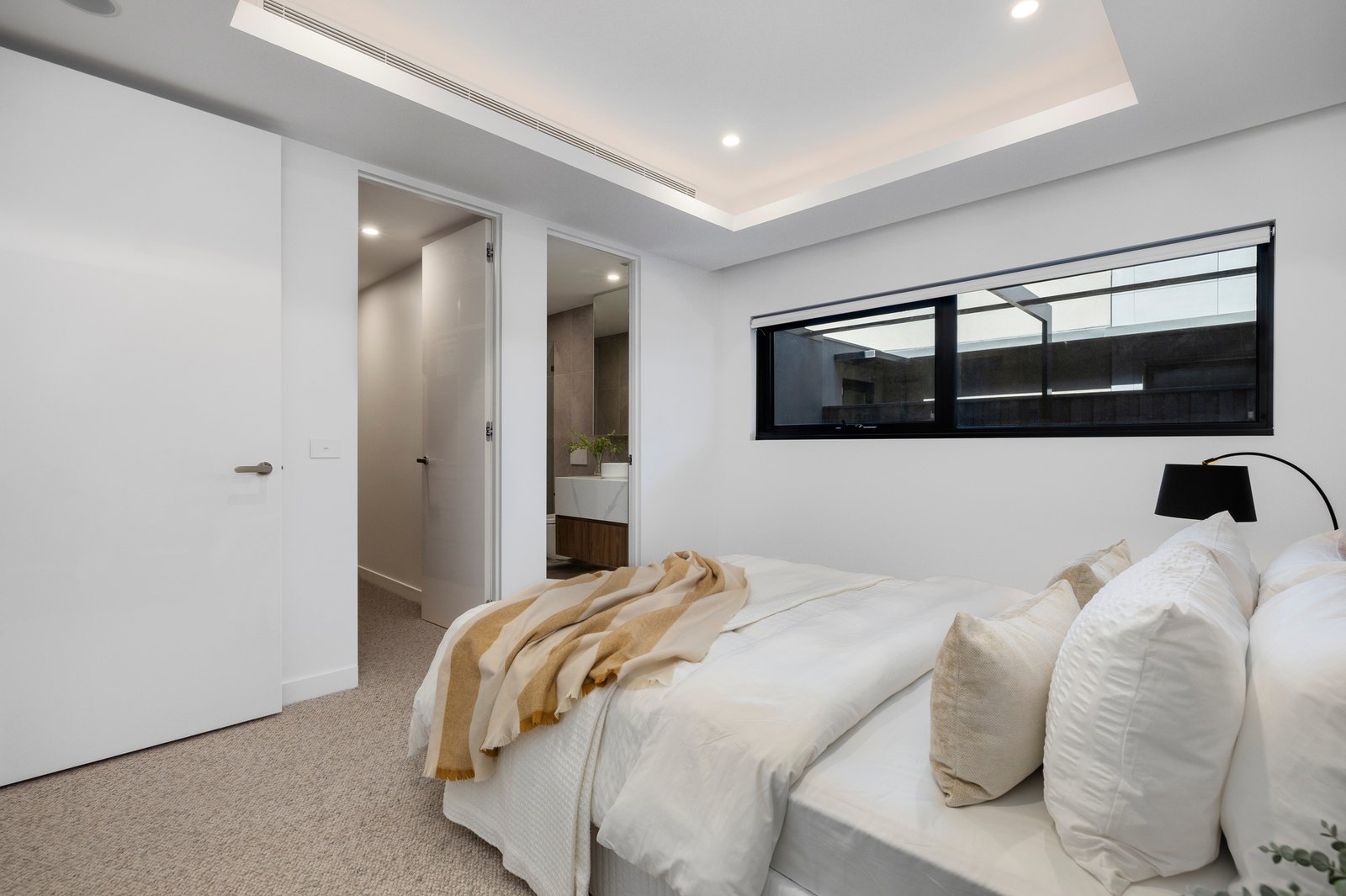 Two lavish bedroom suites deliver the height of comfort, each with a designer ensuite finished in sleek stone, dual rain showers and underfloor heating. The main suite flaunts a custom-fitted walk-in robe and beautiful backlit ceiling enhancing its serene ambience. Additional highlights include a guest powder room, full-size laundry, zoned ducted heating and cooling and extensive storage throughout.