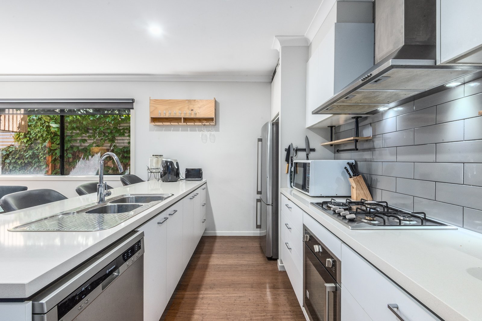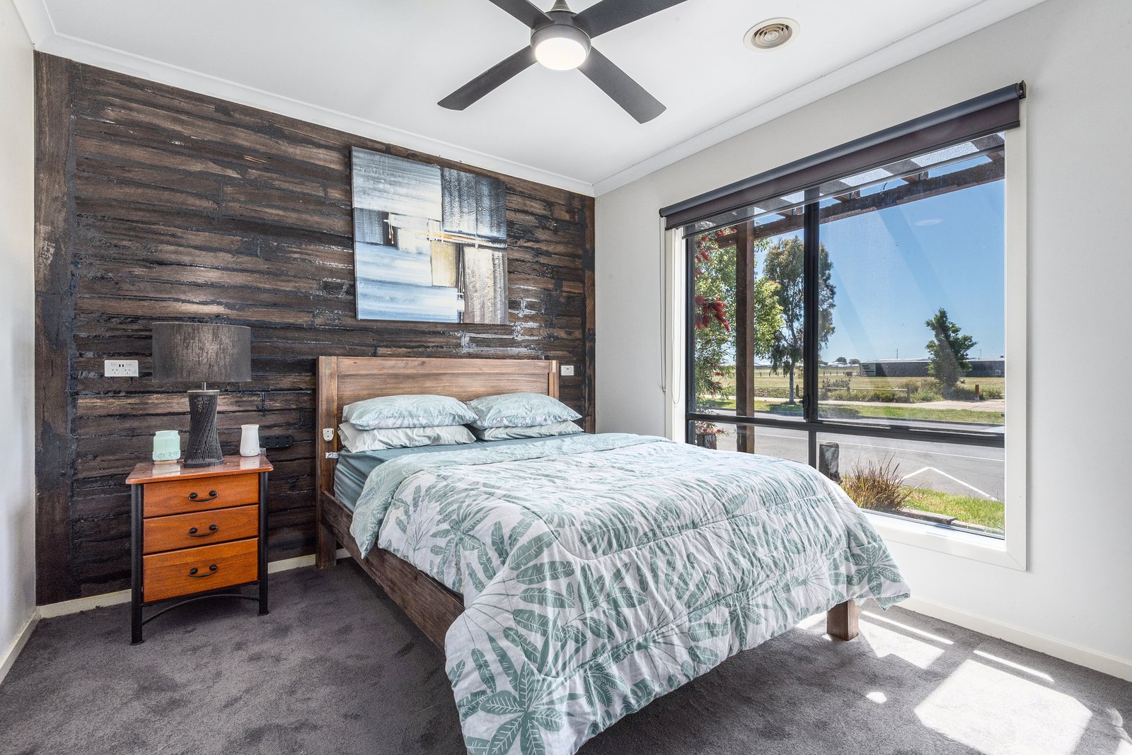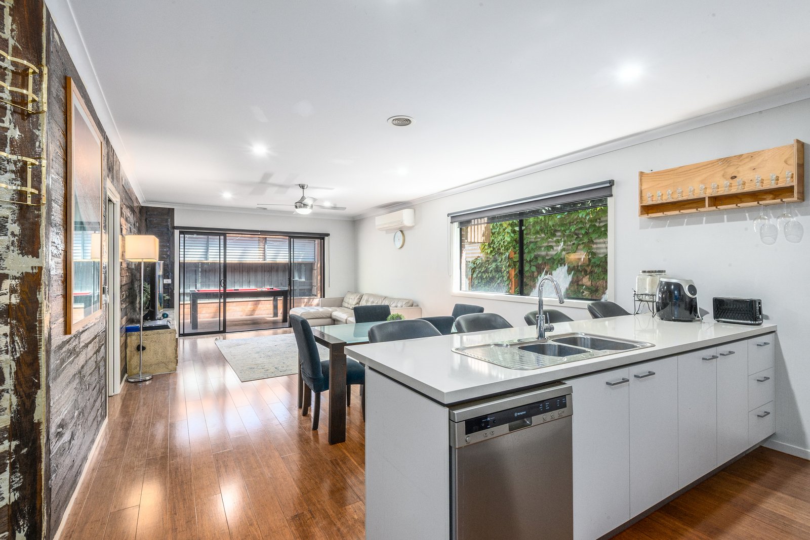 The hub of the home is an open plan kitchen, dining and living area, with north facing windows allowing natural light to flow within, a gas fireplace and timber feature wall creating a cosy and inviting atmosphere. The quality kitchen features stone benchtops, stainless steel appliances including 600mm oven, gas cooktop, rangehood and dishwasher. Glass sliders open up from the living to the alfresco, offering a fantastic layout for indoor-outdoor entertaining.