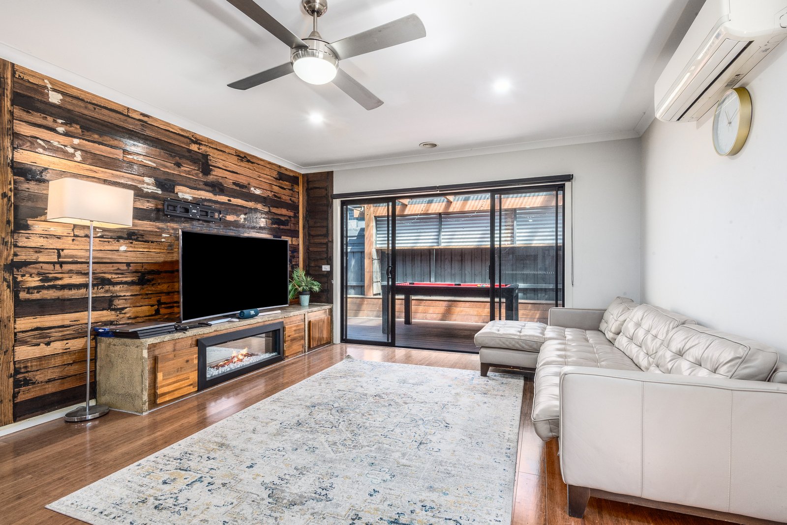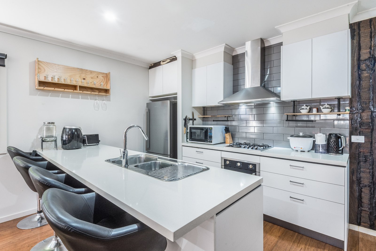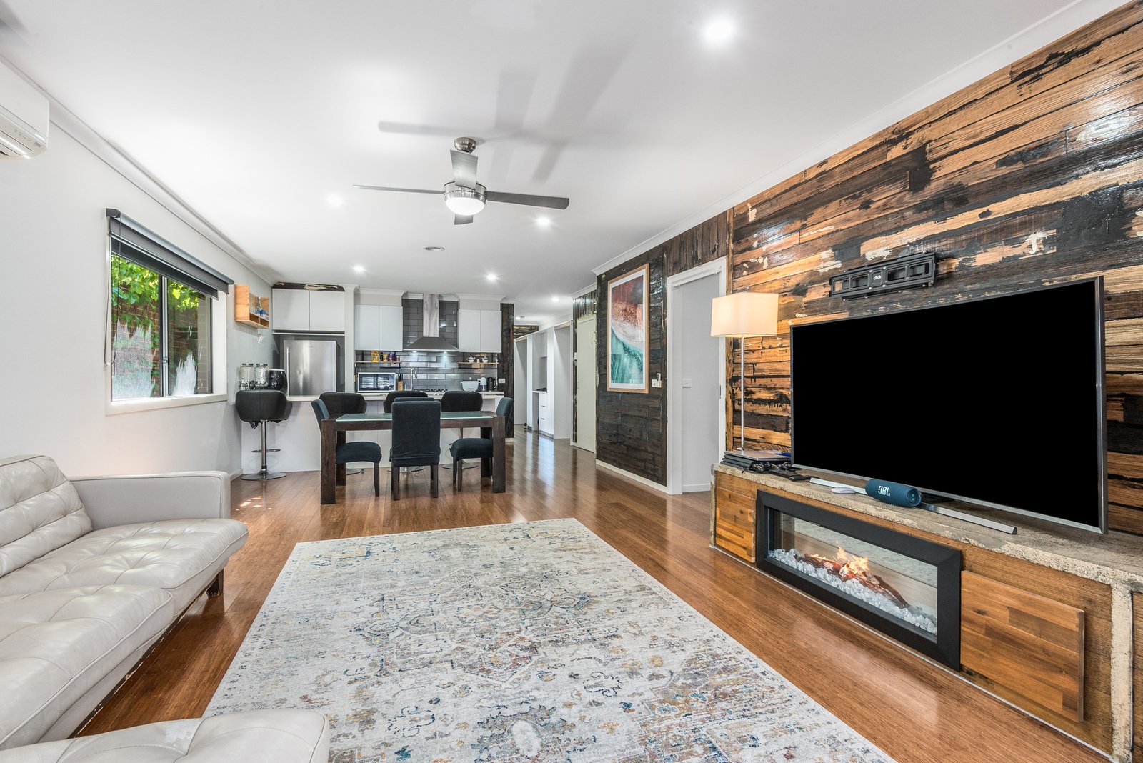 The hub of the home is an open plan kitchen, dining and living area, with north facing windows allowing natural light to flow within, a gas fireplace and timber feature wall creating a cosy and inviting atmosphere. The quality kitchen features stone benchtops, stainless steel appliances including 600mm oven, gas cooktop, rangehood and dishwasher. Glass sliders open up from the living to the alfresco, offering a fantastic layout for indoor-outdoor entertaining.