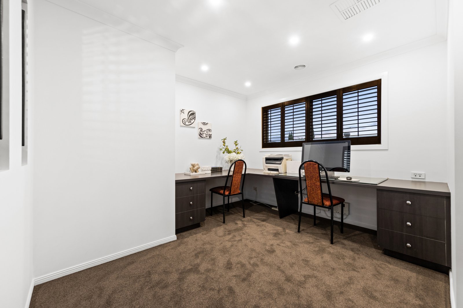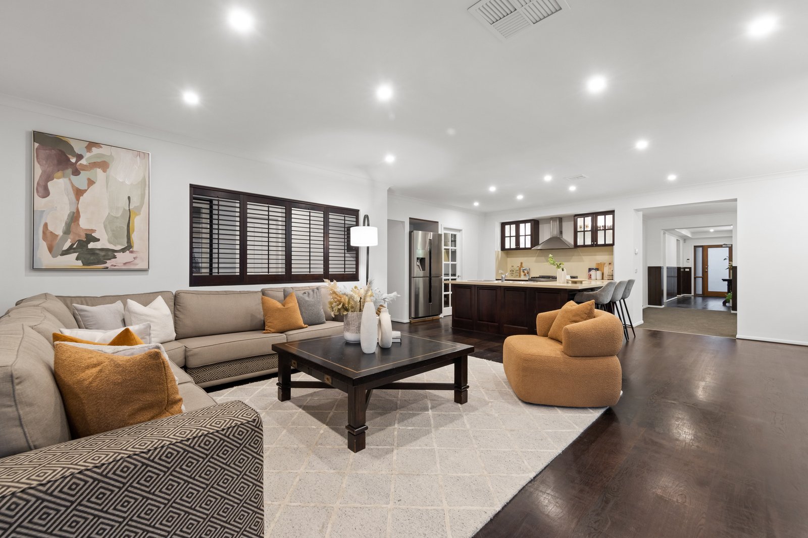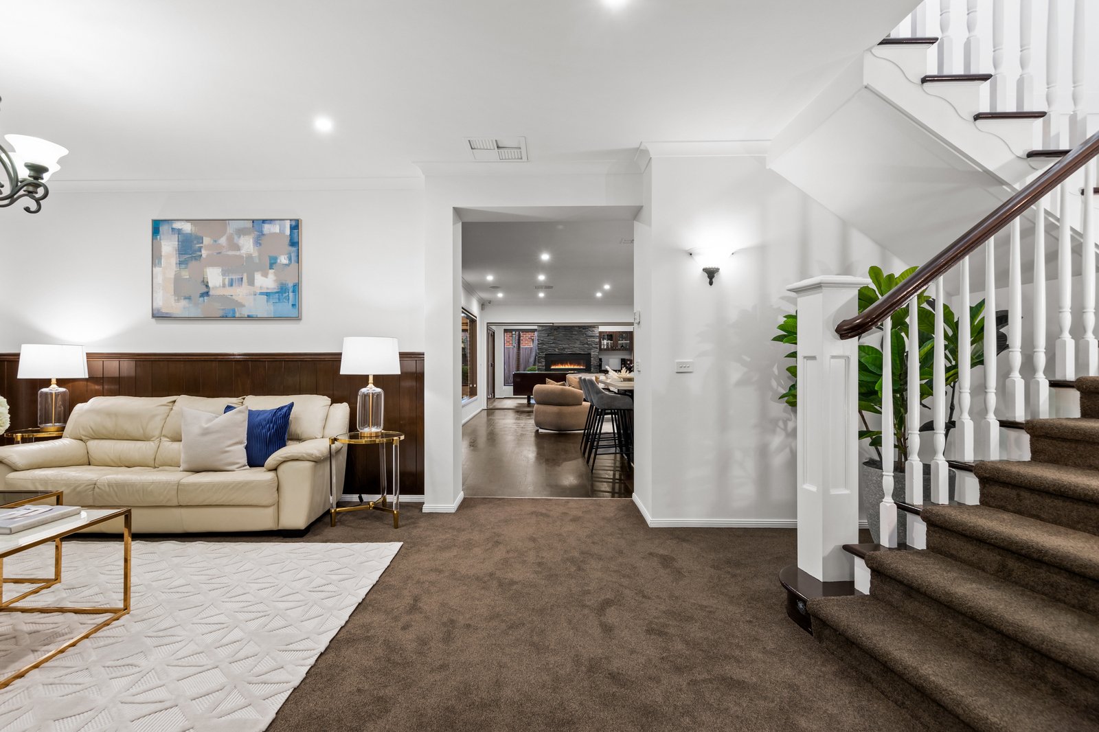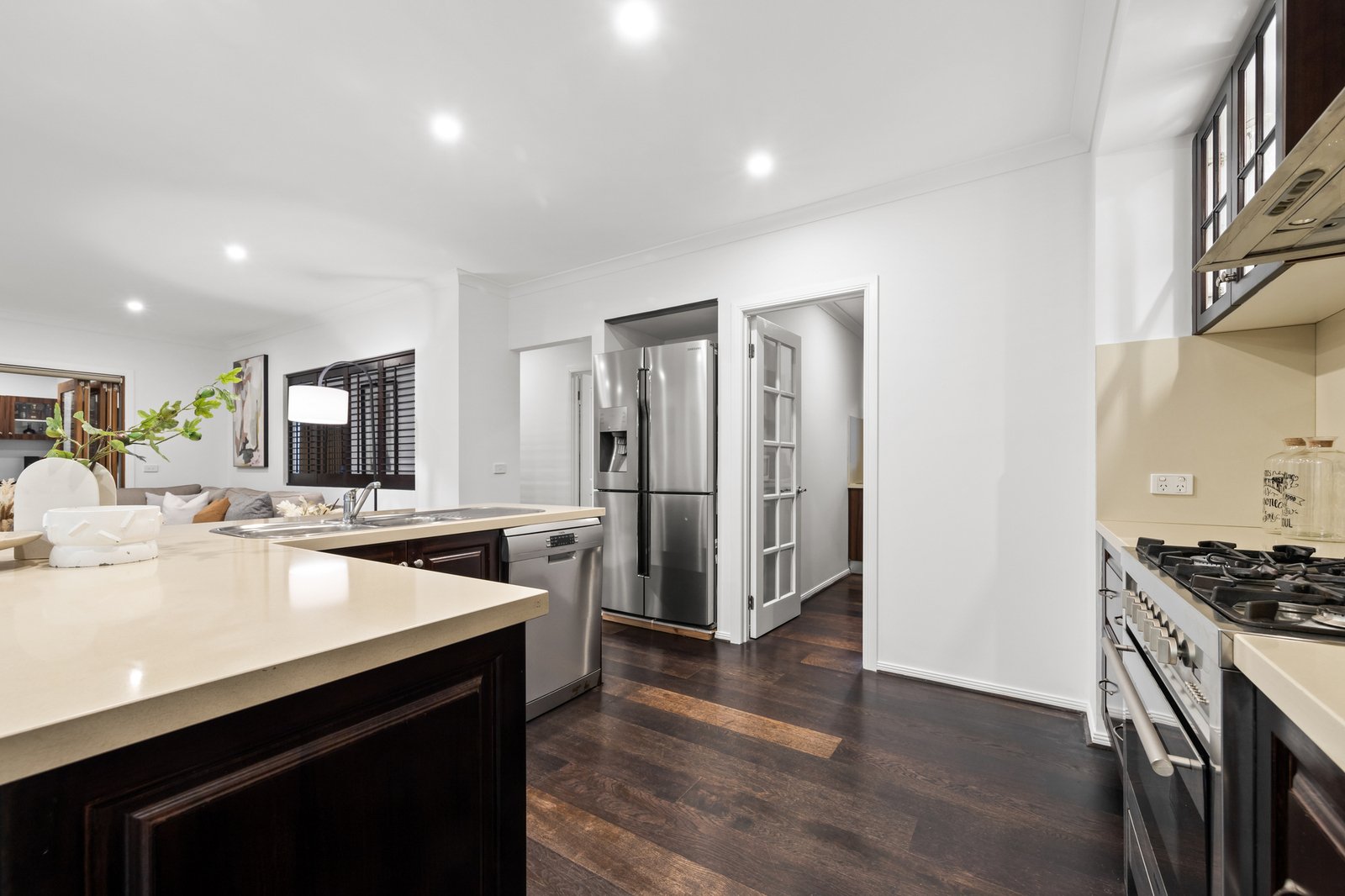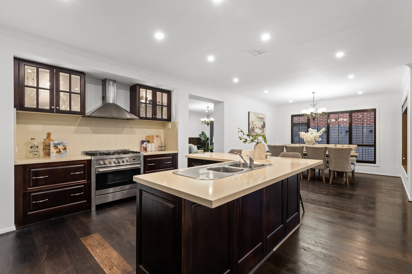 Inside, a dedicated study or home office offers the perfect environment for remote work, while the formal living area provides a cozy retreat for hosting guests or quiet evenings. At the heart of the home is a kitchen with a dishwasher, Blanco oven and stove, and a full butler’s kitchen, ideal for seamless meal preparation and entertaining. The kitchen flows effortlessly into the dining and family areas, extending into the rumpus room, perfect for everyday living and social gatherings.
