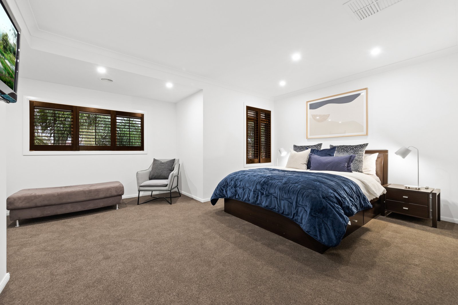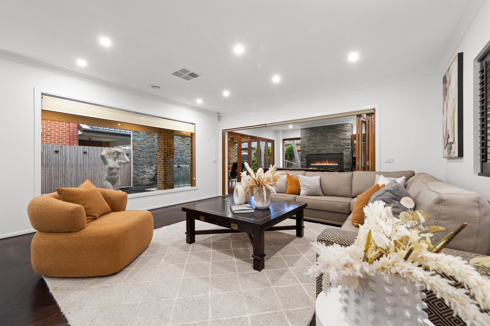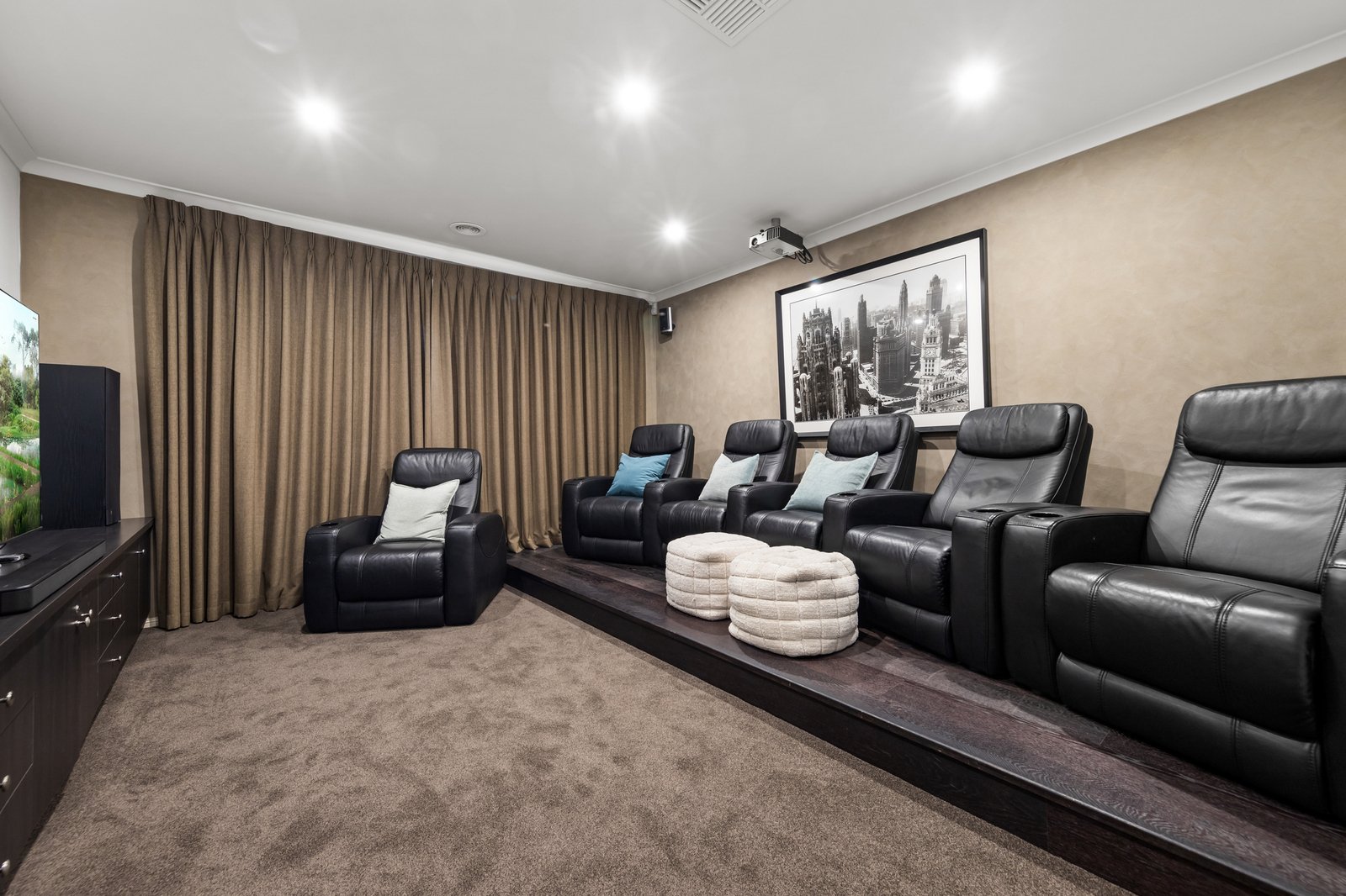 The ground floor also includes a private master suite with a walk-in robe and ensuite, ideal for multi-generational living or accommodating guests. A dedicated theatre room sets the scene for immersive movie nights, while a laundry with outdoor access adds everyday convenience.