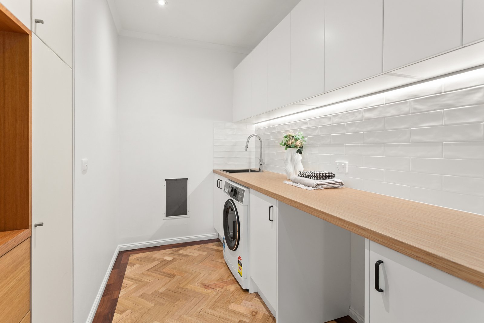 The light-filled open-plan living room flows seamlessly to a modern kitchen and dining area with stainless steel appliances and ample storage, creating a warm and inviting space for everyday living. The master bedroom enjoys a private ensuite and walk-in robe (WIR), while the second bedroom features built-in robes. A fully renovated laundry, complete with excellent storage and a flexible study nook, adds to the functionality.