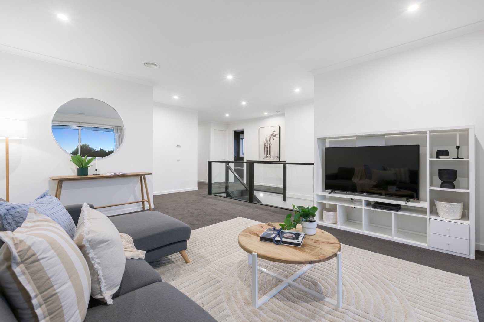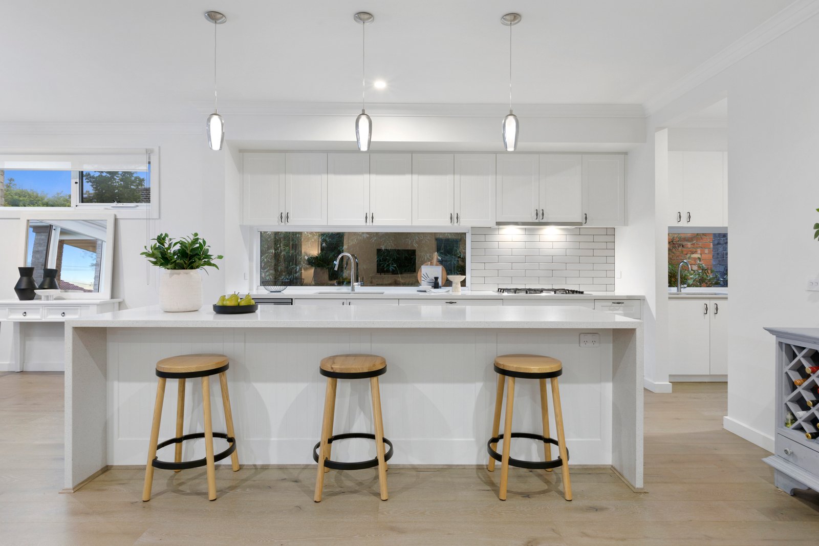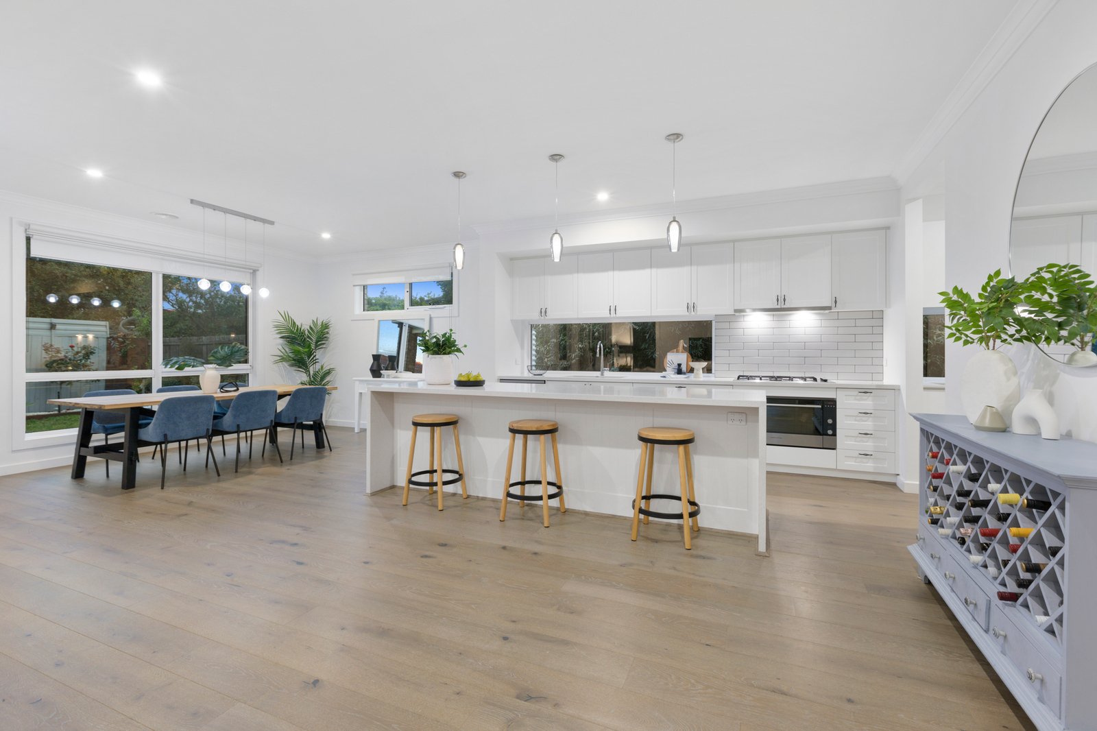 Downstairs, an open plan living/dining zone and stunning kitchen combine to create a space tailor-made for entertaining. The kitchen is centred around a waterfall-edge island and features quality appliances, shaker-style cabinetry and a genuine butler pantry.