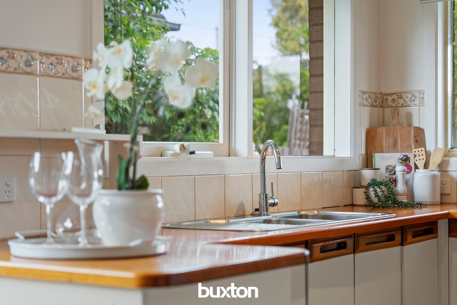 A neat kitchen is detailed by a hardwood timber bench and has an adjoining tiled meals area opening to a side courtyard – perfect for breakfast al fresco.