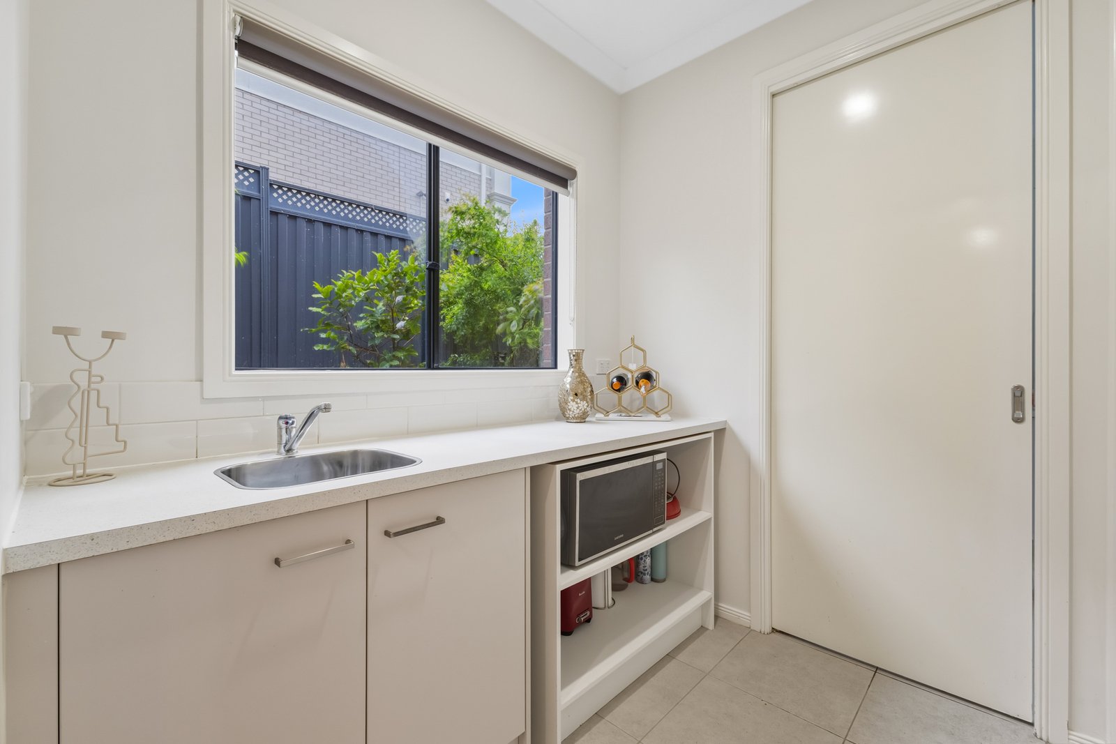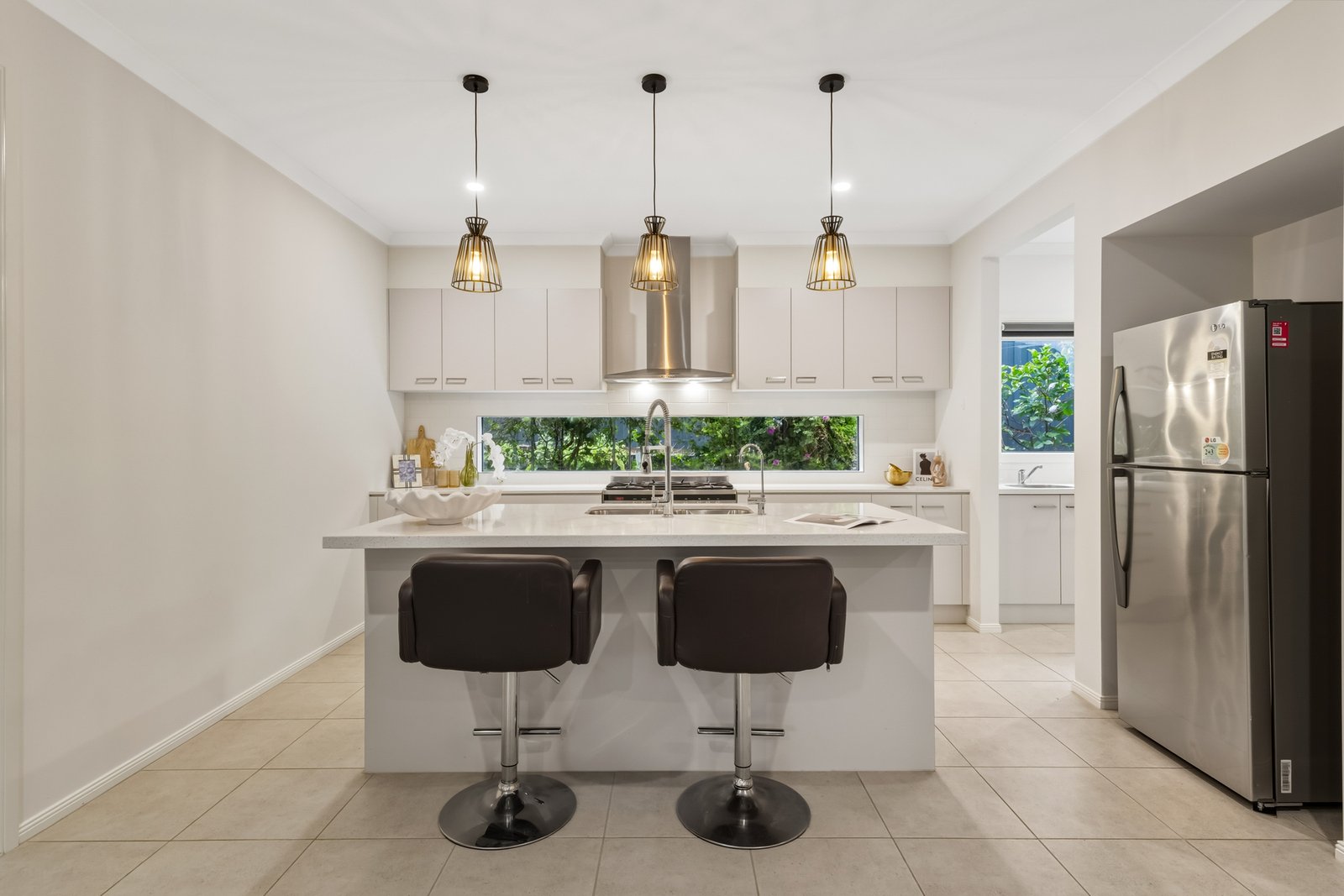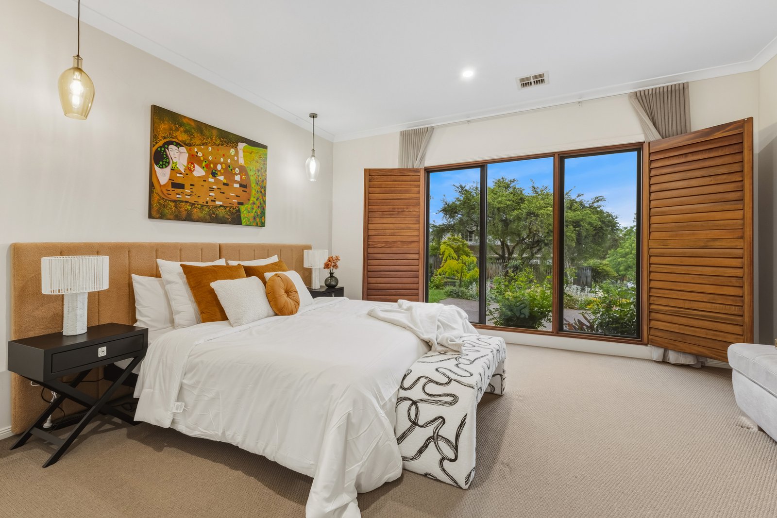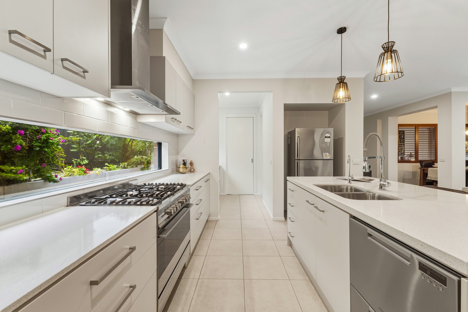 The elegant kitchen and butler’s pantry provide a top shelf cooking experience with a 90cm cooker, sleek stone benches and a café window to admire the flourishing garden of more than 20 fruit varieties.